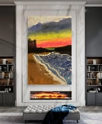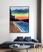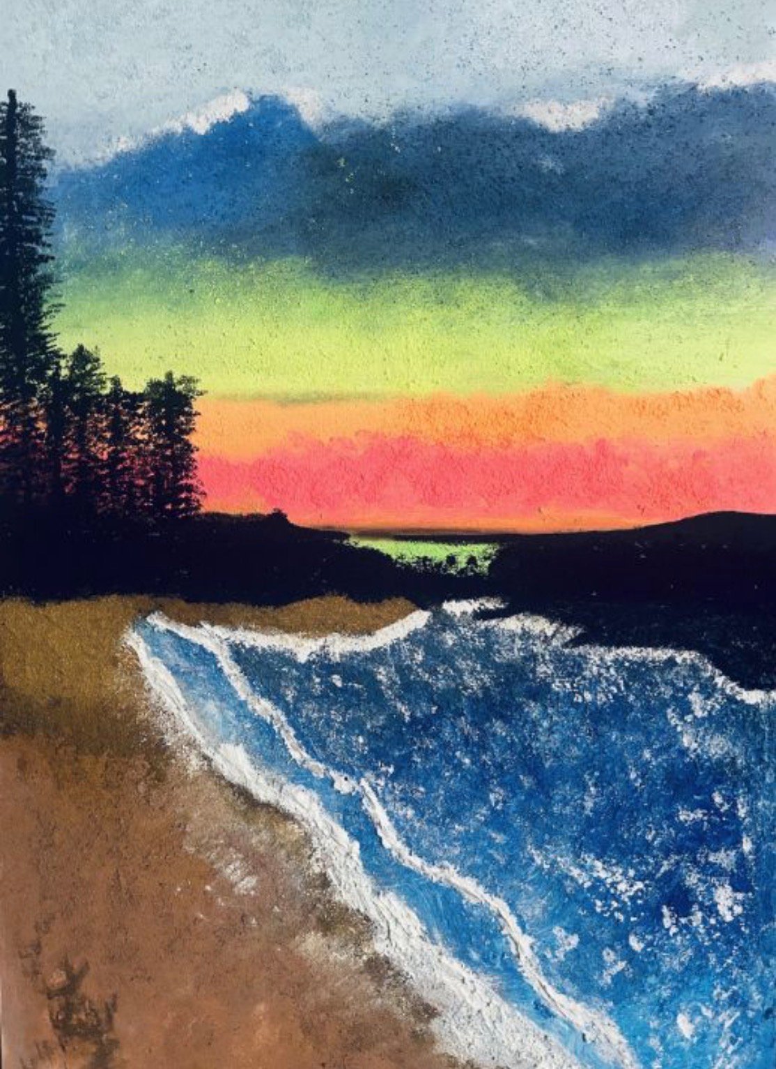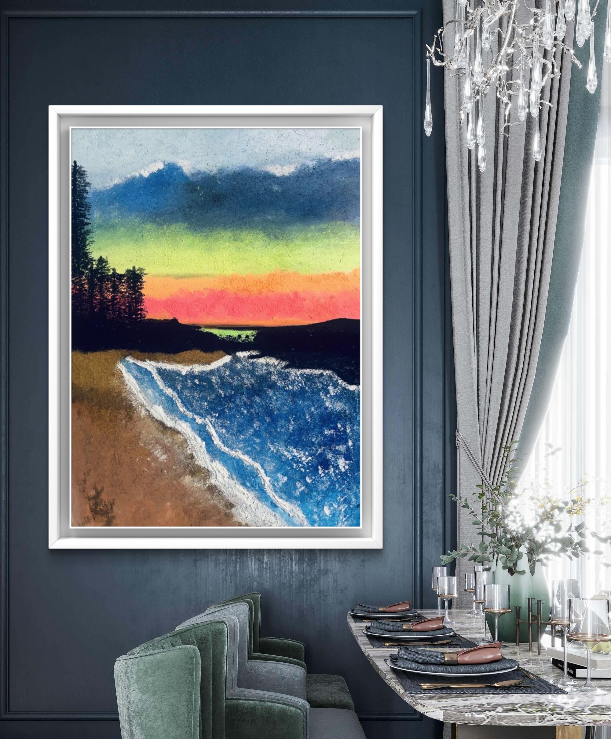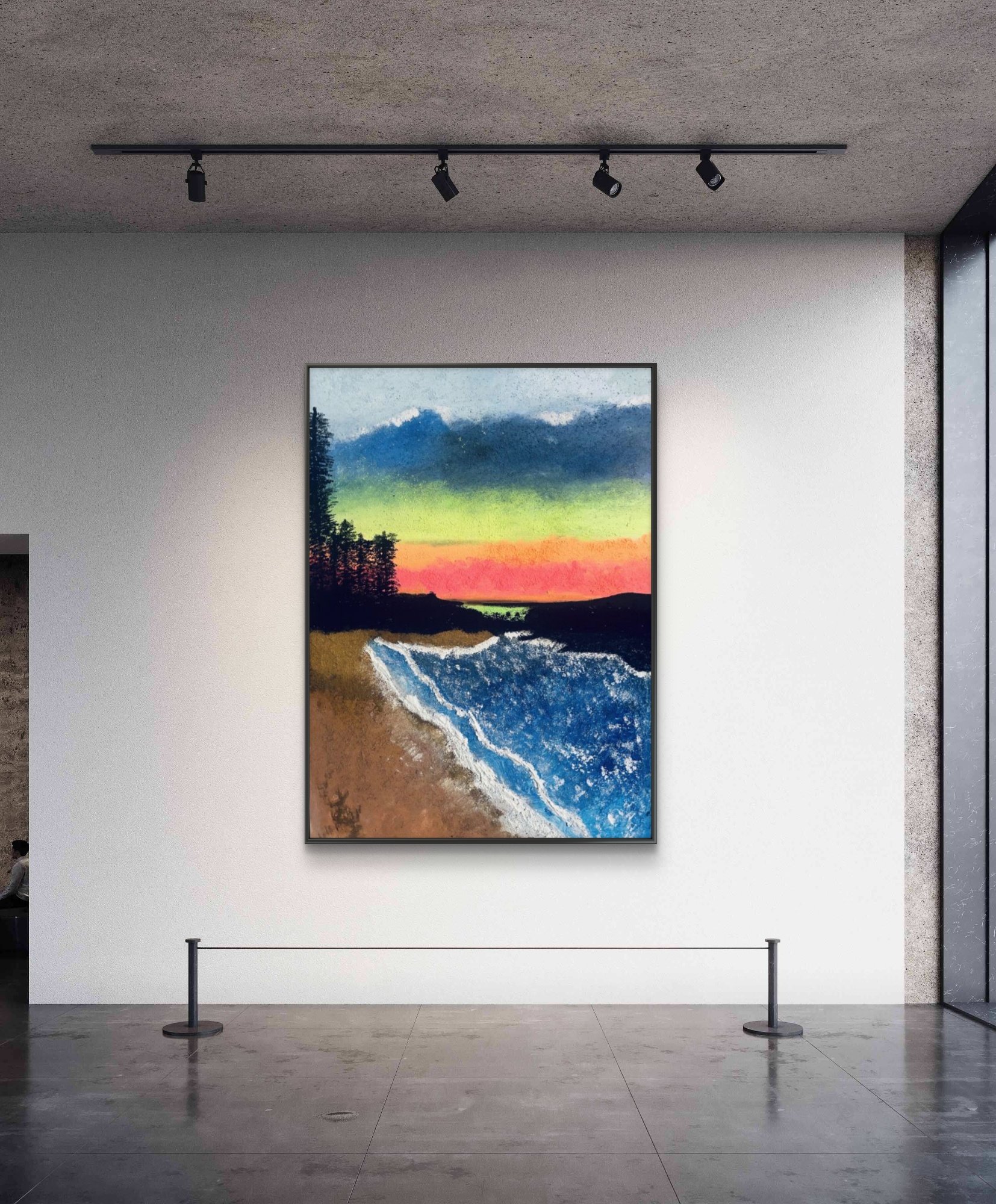 Across The Lands is a texture acrylic painting using sand and paint to give the painting a realism of the water sky and sand. the bright colors of the blues, green and hot pink gives the sky a beautiful high light.
