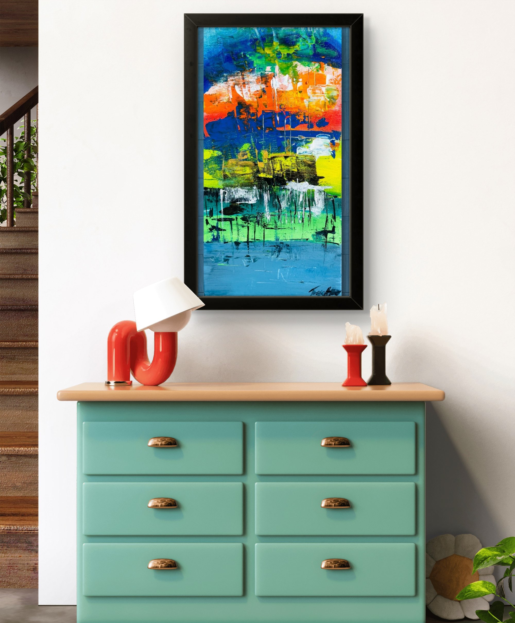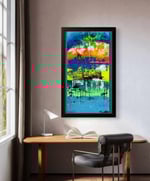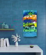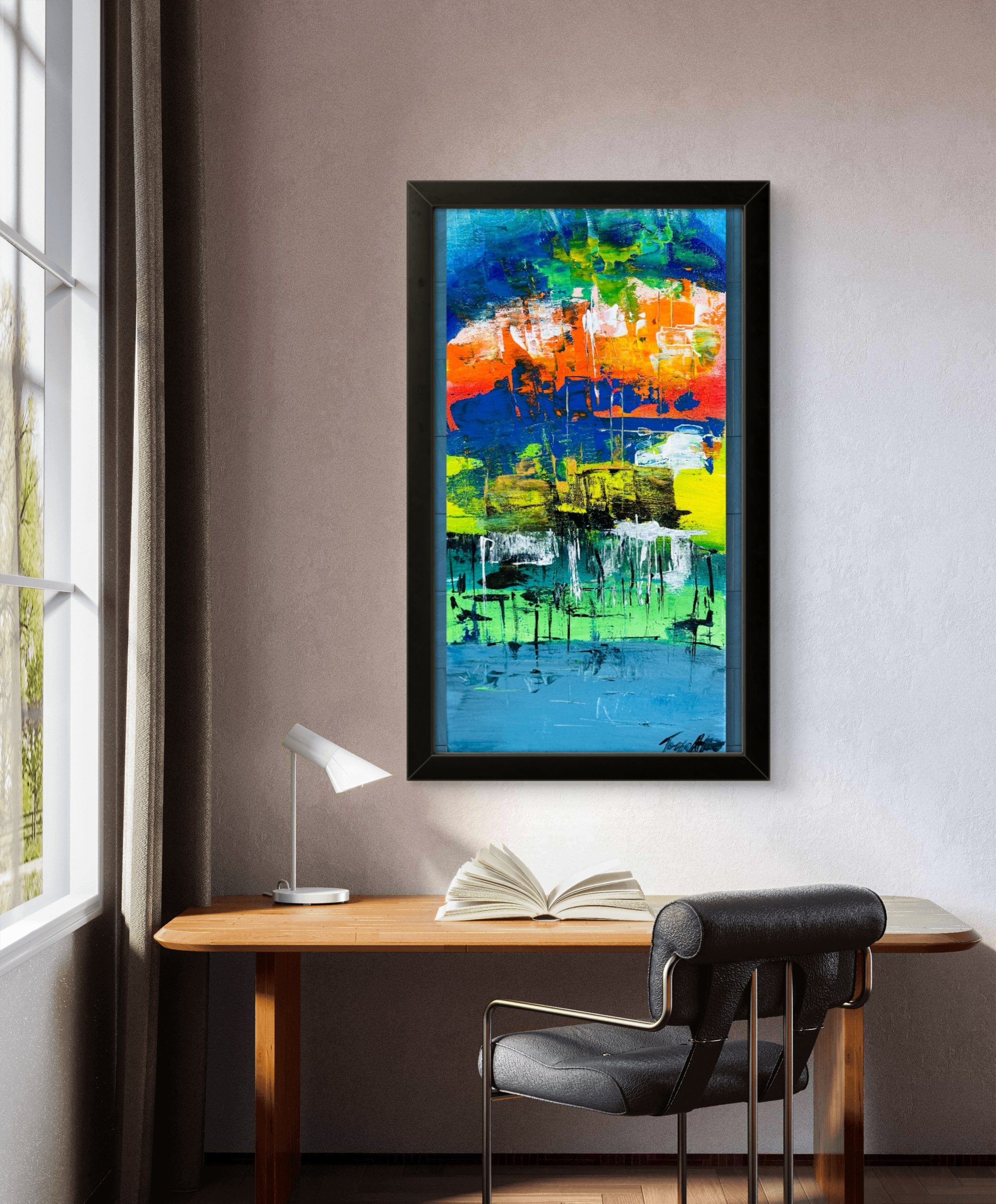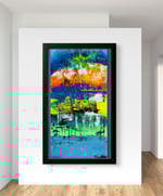Bizarre land is a Acrylic Abstract Painting. This painting brings out the deep depth colors of greens, orange, yellow white/ nylon green. year of painting 2023