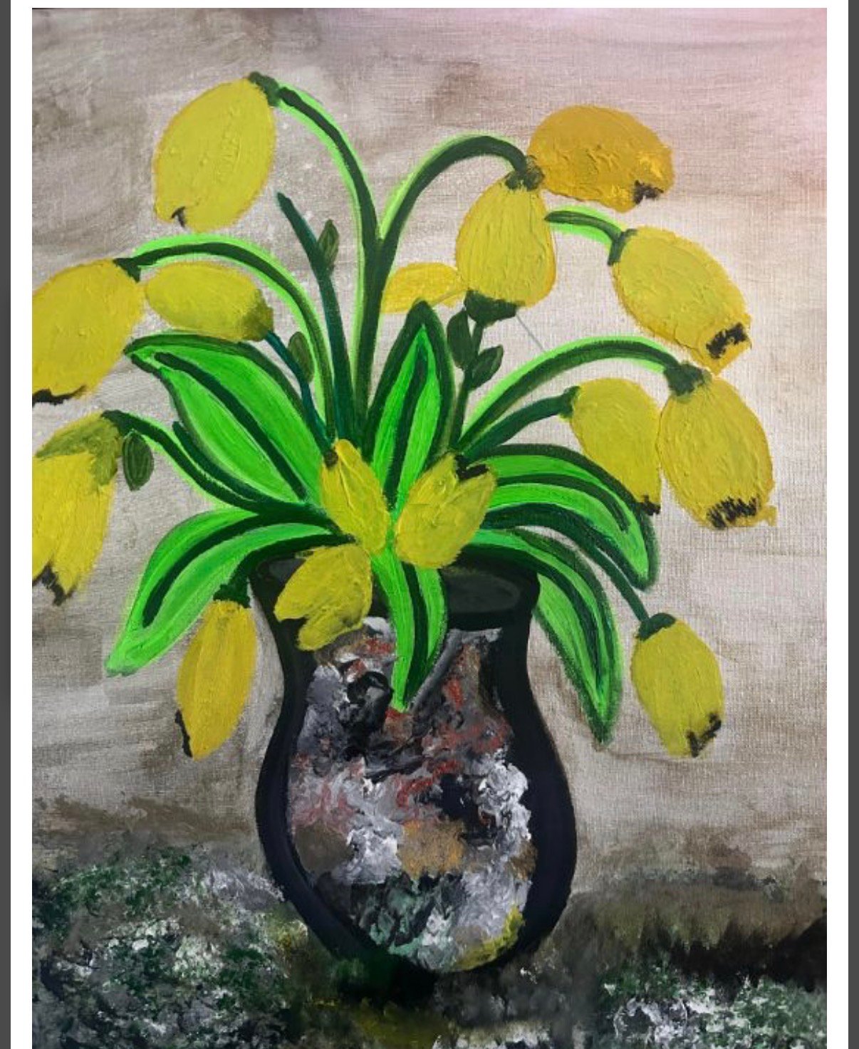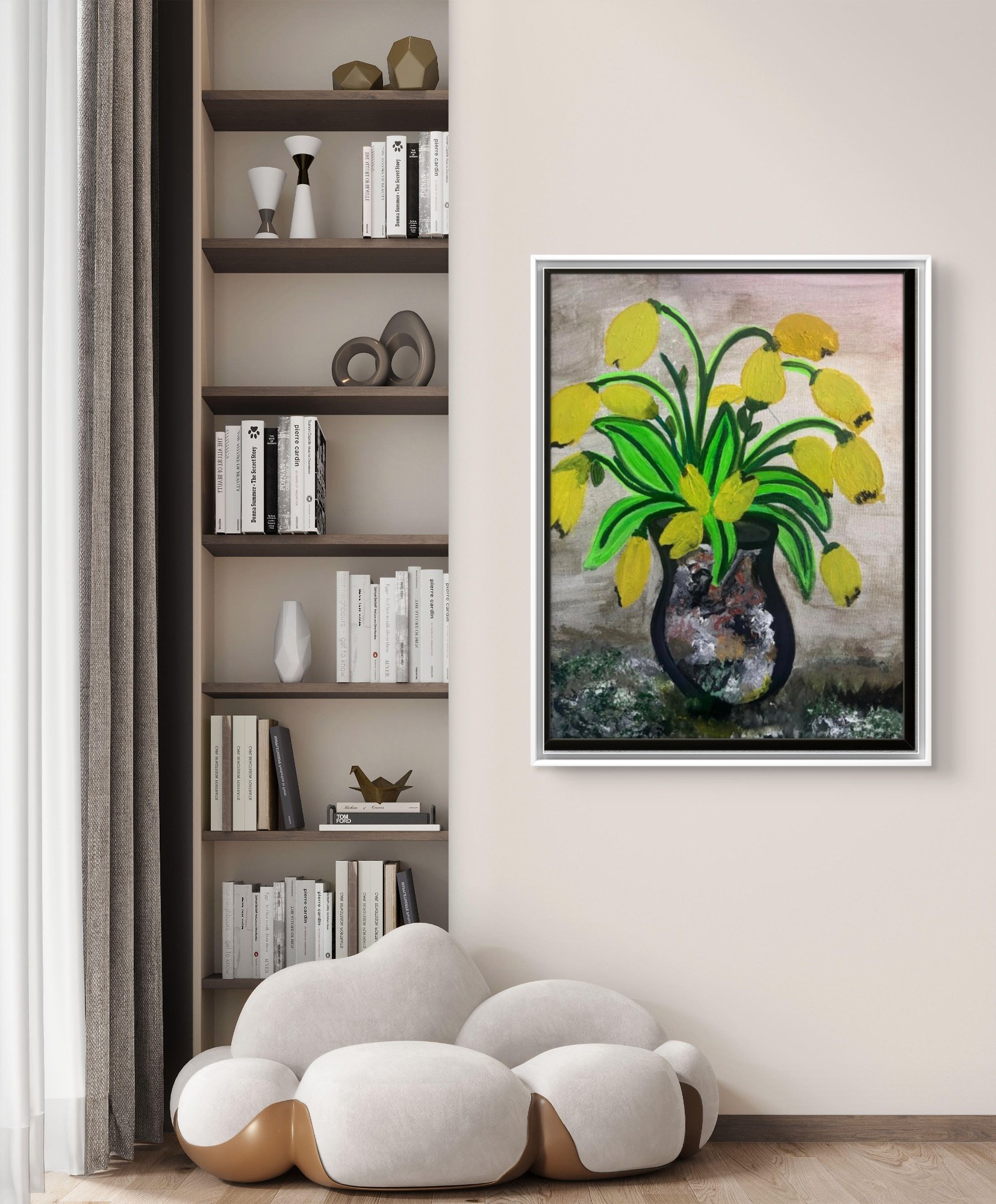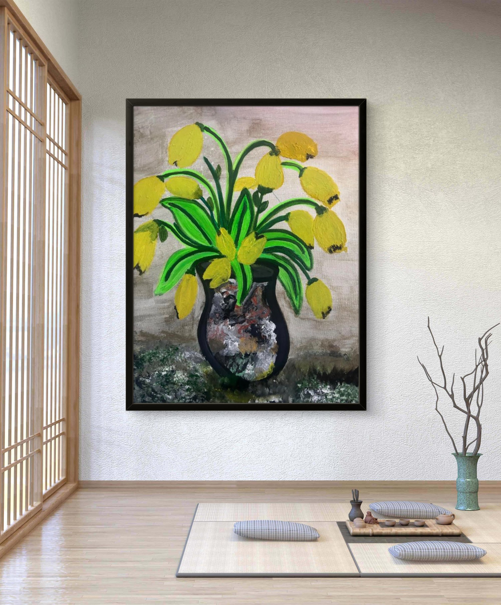 cheerful Thoughts is a textured acrylic painting, this painting brings a delightful energy for a lovely home. The colors of the yellow and green gives an amazing Blend. The vase is also giving a marble abstract look.