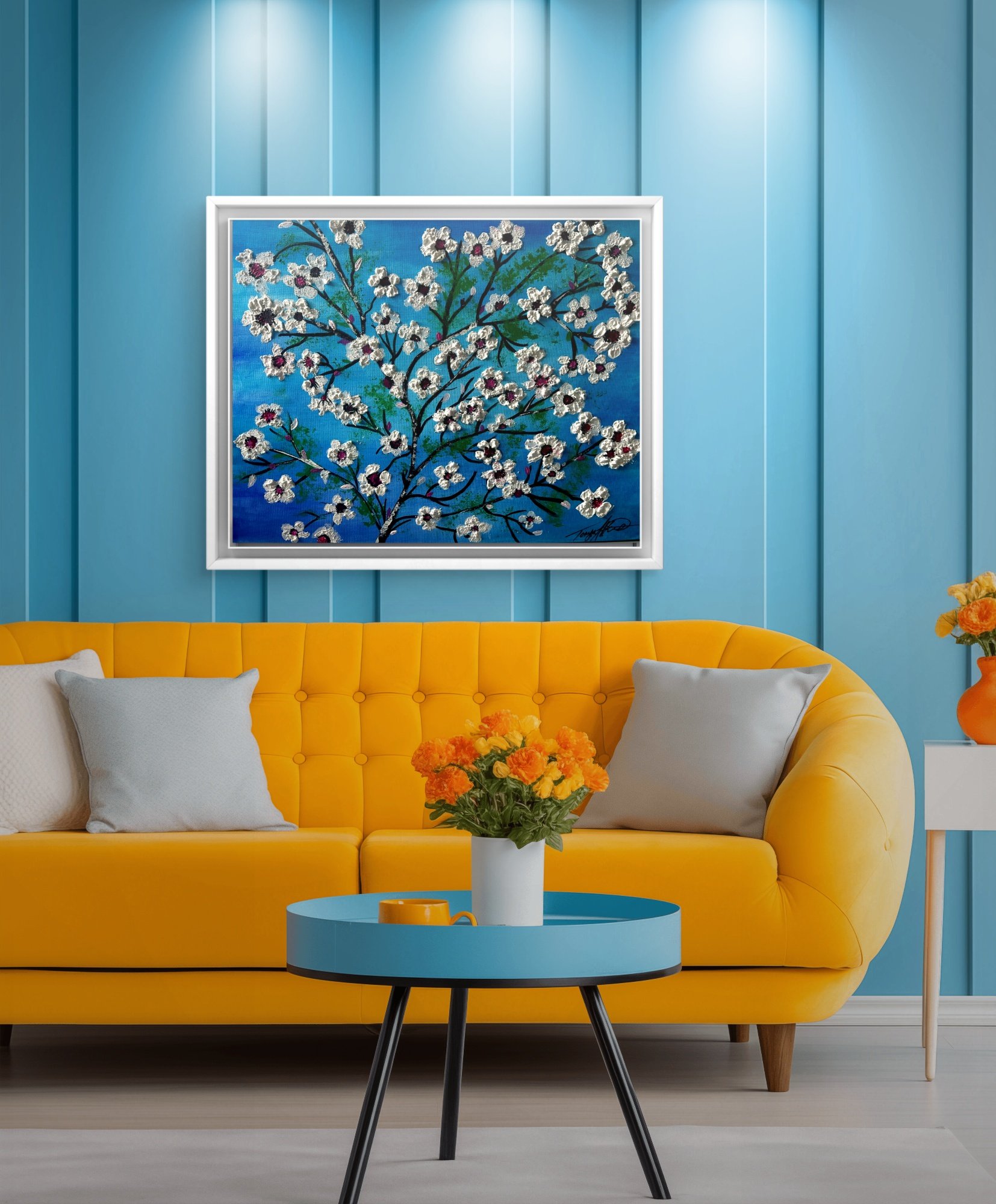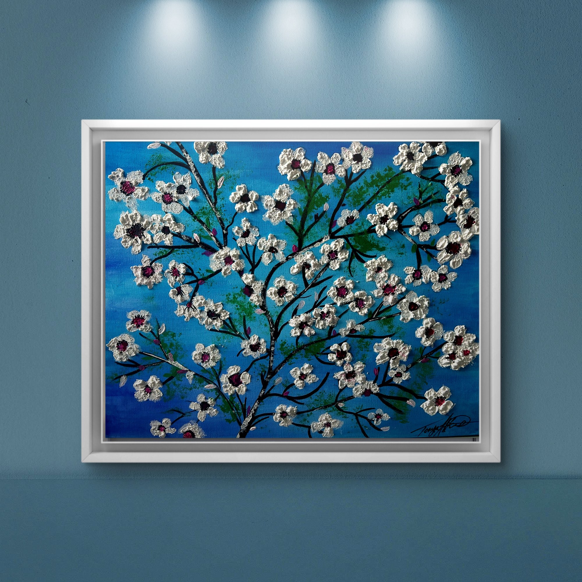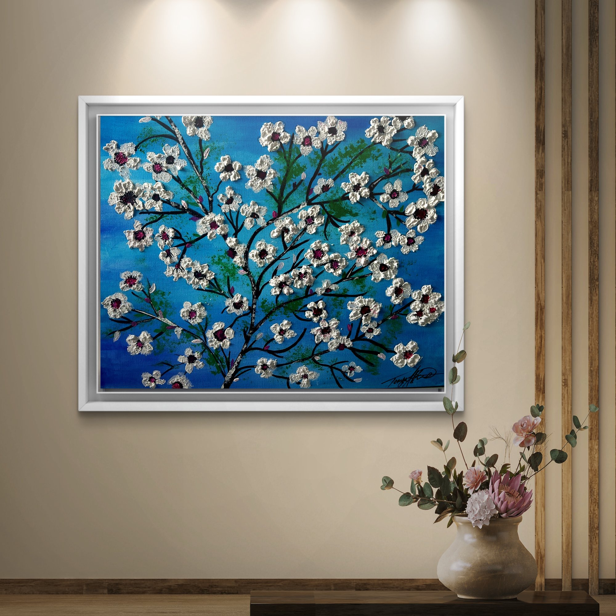 "Cheery Blossom Whisper" captures the soul of renewal through a captivating fusion of watercolor serenity, bold acrylic strokes, and exquisite textural detail. This original piece features blooming white cherry blossoms dancing across a graceful black branch, each petal raised with thick, expressive texture that seems to bloom right off the canvas. The pops of magenta and deep berry at the heart of each flower provide the perfect contrast—both passionate and tender.