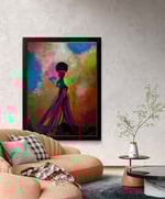 This acrylic painting features a powerful silhouette of a woman standing confidently against a vibrant and abstract background. The figure is depicted in deep black, accentuating her strong presence and emphasizing her elegant posture. She wears a multicolored headband that adds a subtle yet striking detail to her afro, and a flowing gown that cascades around her like a waterfall of colors—bright pinks, blues, and yellows. The background is a swirling blend of colors—pinks, greens, blues, and soft grays—that creates a dreamy, ethereal atmosphere. The contrast between the solid figure and the fluid, colorful background symbolizes resilience and grace emerging from the complexities of life.