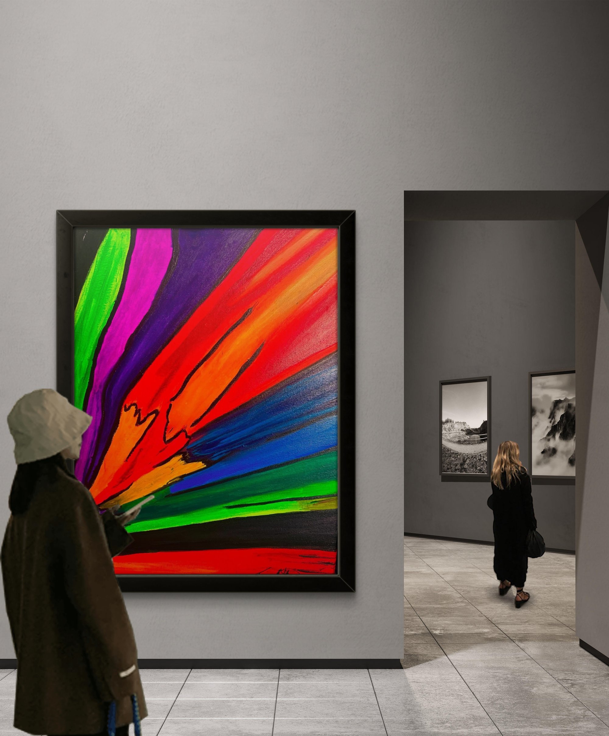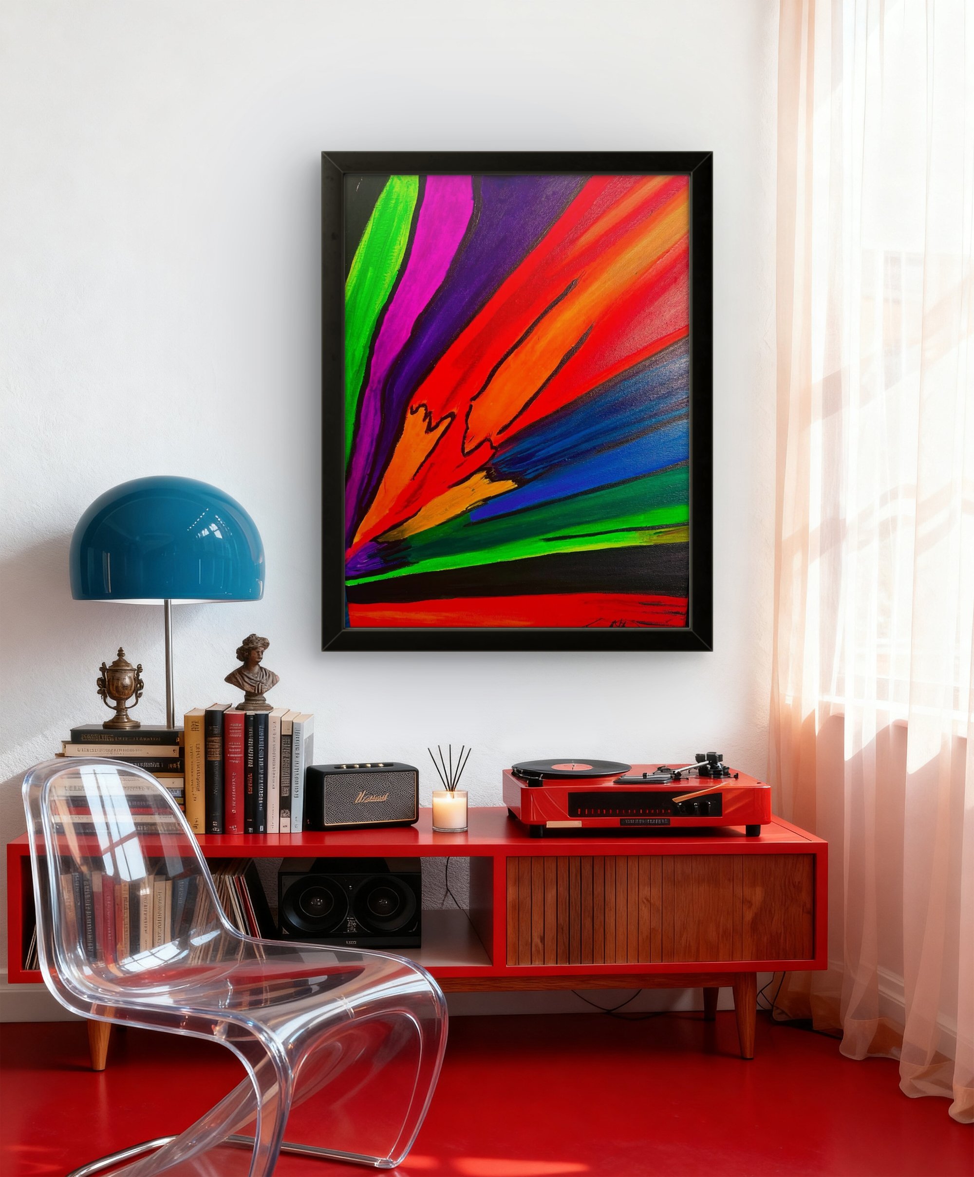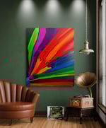 THIS PAINTING TELLS A STORY OF COLOR EXPLOSING IN THE SKY. THE BLENDED COLOR GIVE YOU AN EXCITING FEEL OF GREATNESS OR POSITIVITY IN THE AIR.