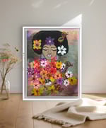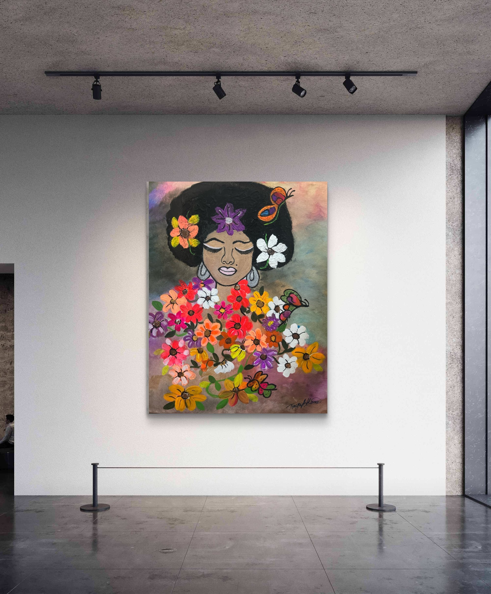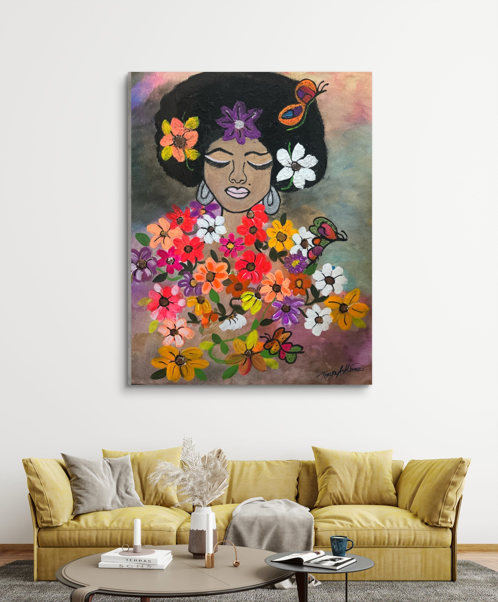 A soulful woman with closed eyes embodies tranquility, her afro adorned with vibrant flowers, symbolizing strength, beauty, and connection to nature. She is surrounded by a cascade of blooming flowers in rich, warm colors—reds, oranges, yellows, purples, and whites—representing diversity, joy, and resilience. Butterflies float among the flowers, adding a sense of transformation and freedom. The soft pastel background enhances the peaceful atmosphere, creating a feeling of harmony and inner peace. 50x 60