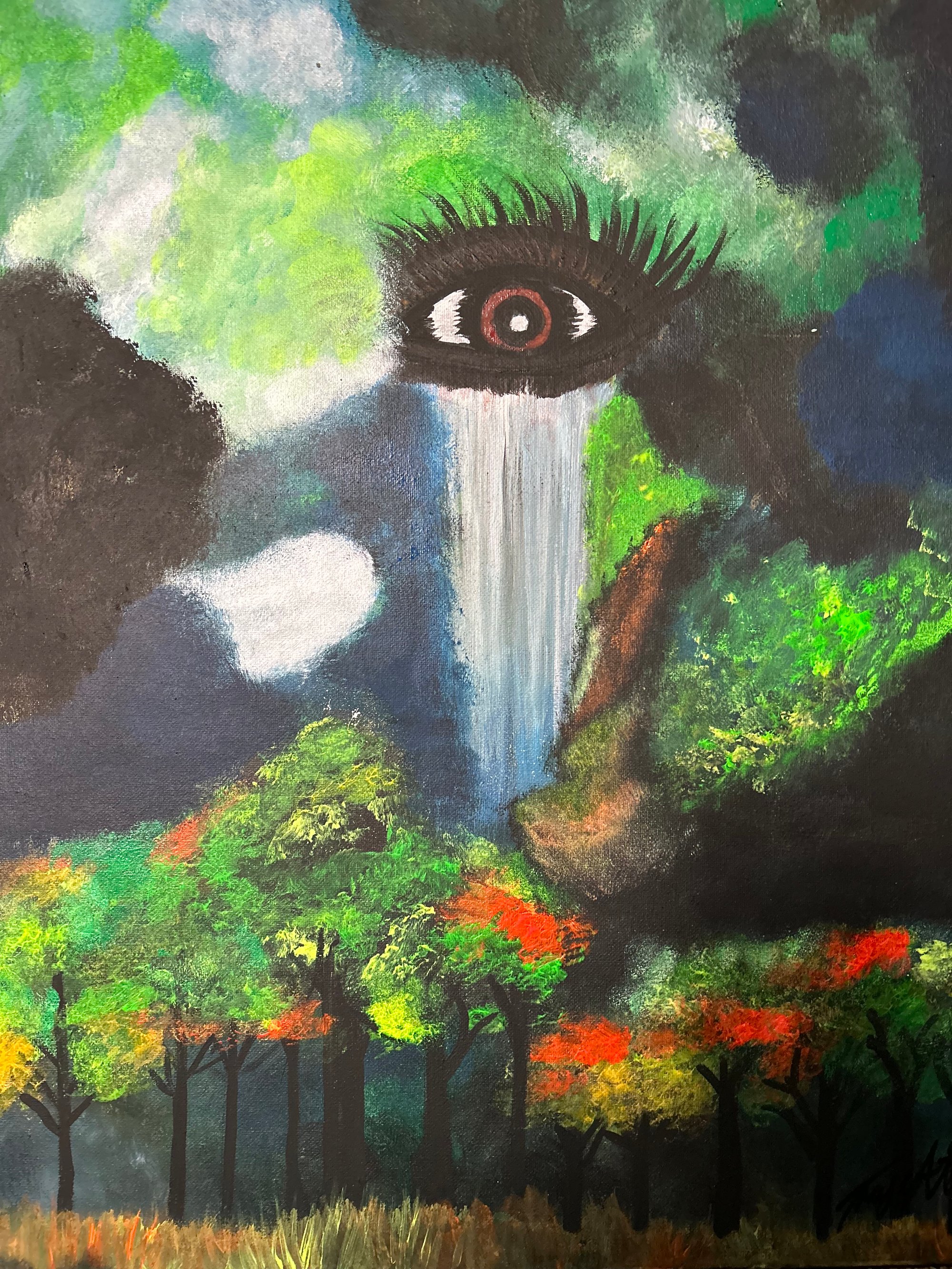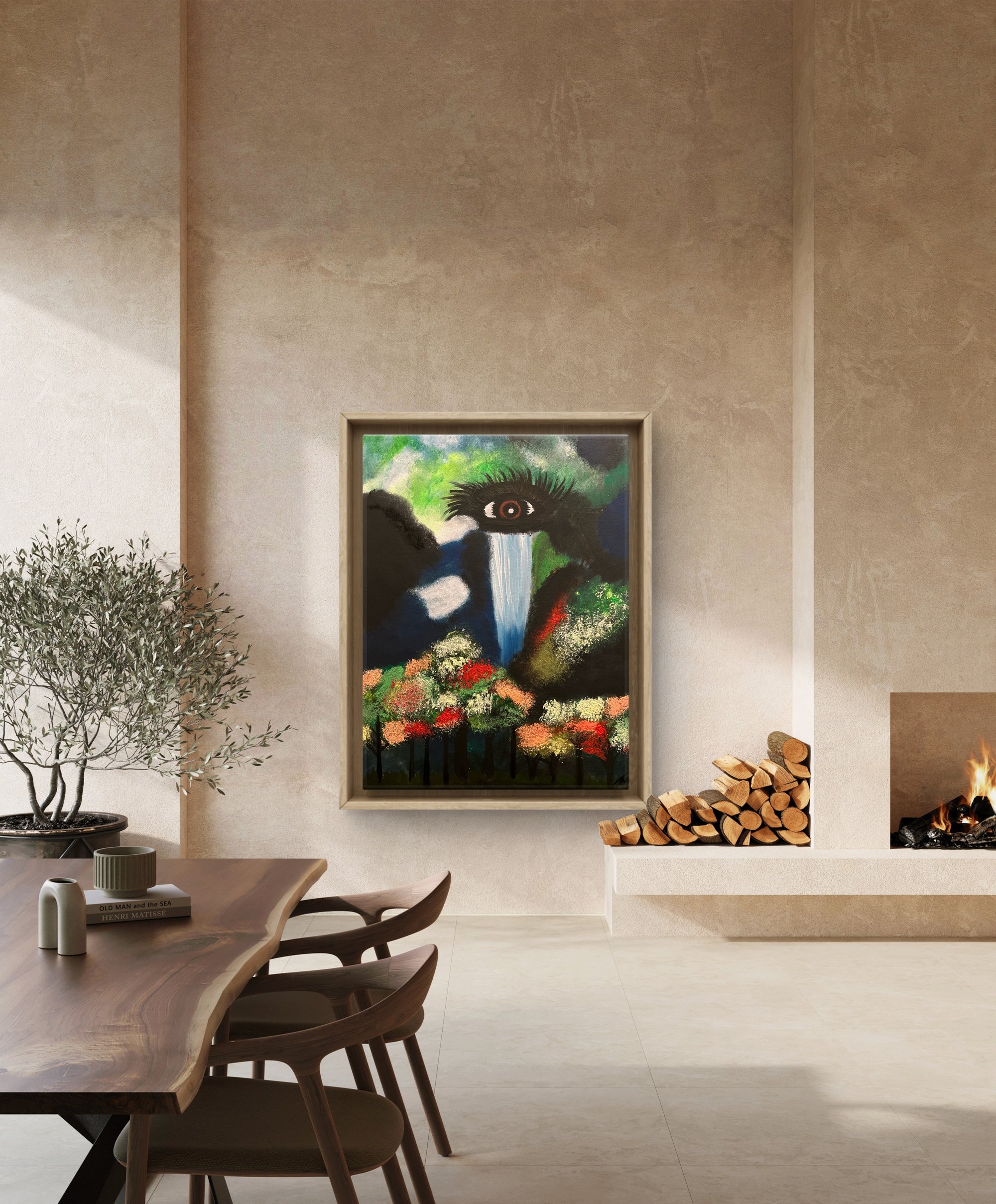 In “God sees All” God’s watchful eye rests above the mountains and flowing rivers, blessing every flower and every part of the land. This piece radiates spiritual protection and the quiet comfort of knowing we are never unseen.