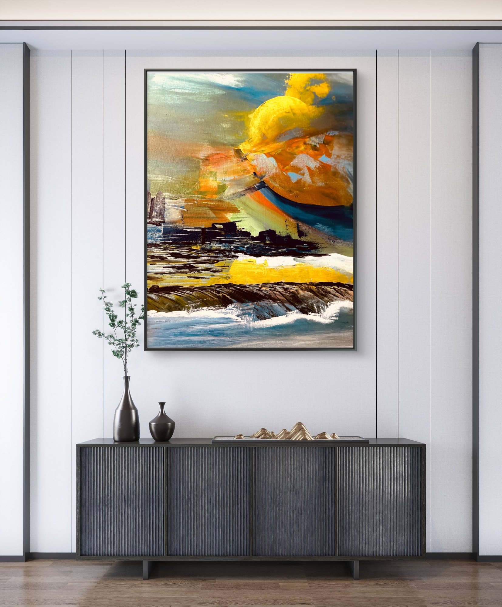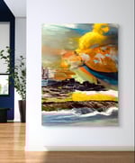 God’s Unknown” is an acrylic landscape where cosmic light emerges from the sea, blending rich hues of orange, blue, yellow, and white. The scene offers depth, mystery, and a peaceful sense of the divine