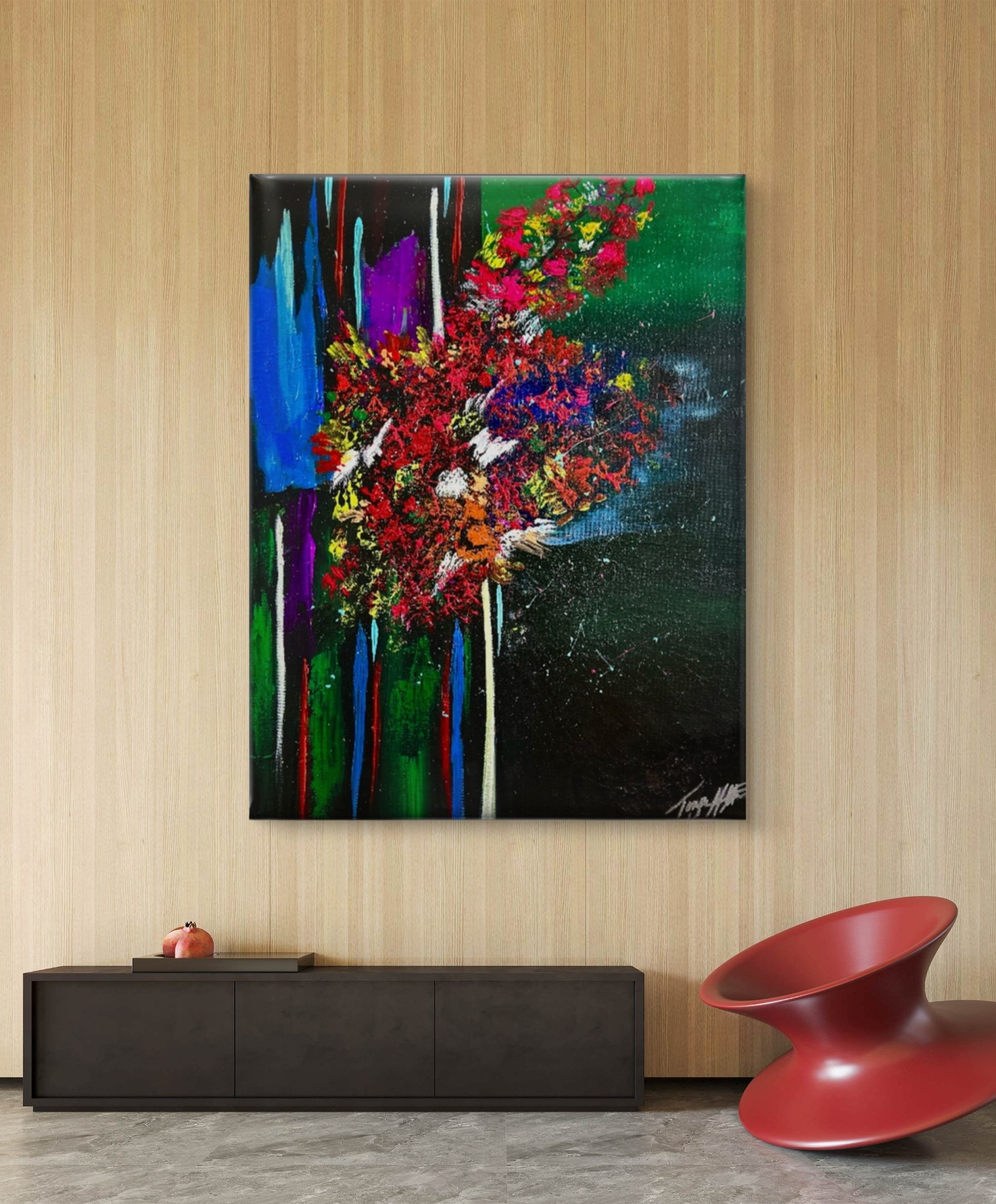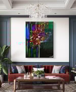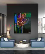 A dynamic abstract bursting with radiant blues, reds, purples, and pinks. Each vibrant splash blends into a luminous, energetic flow, creating a striking statement piece that brings color, movement, and modern elegance to any space.