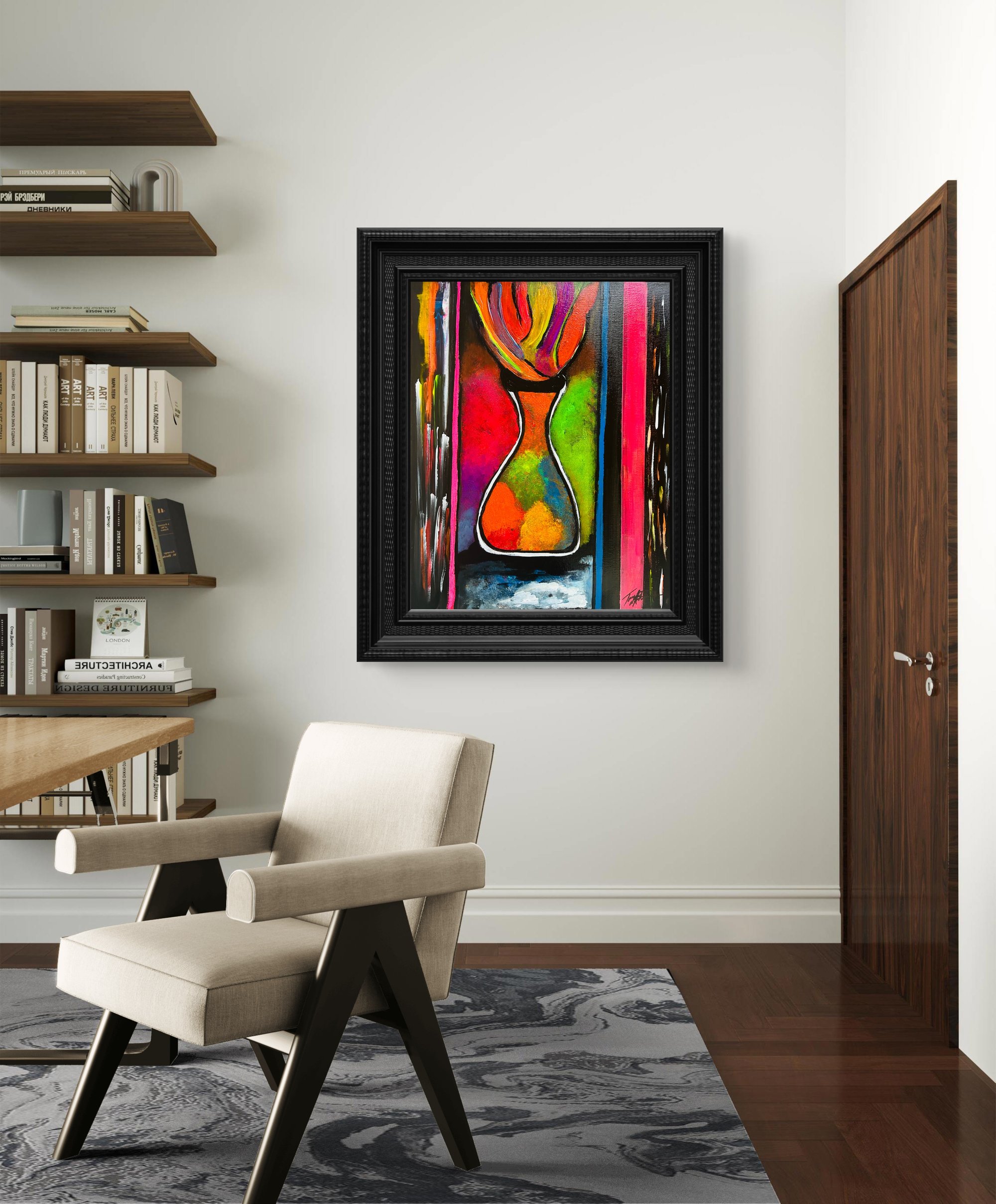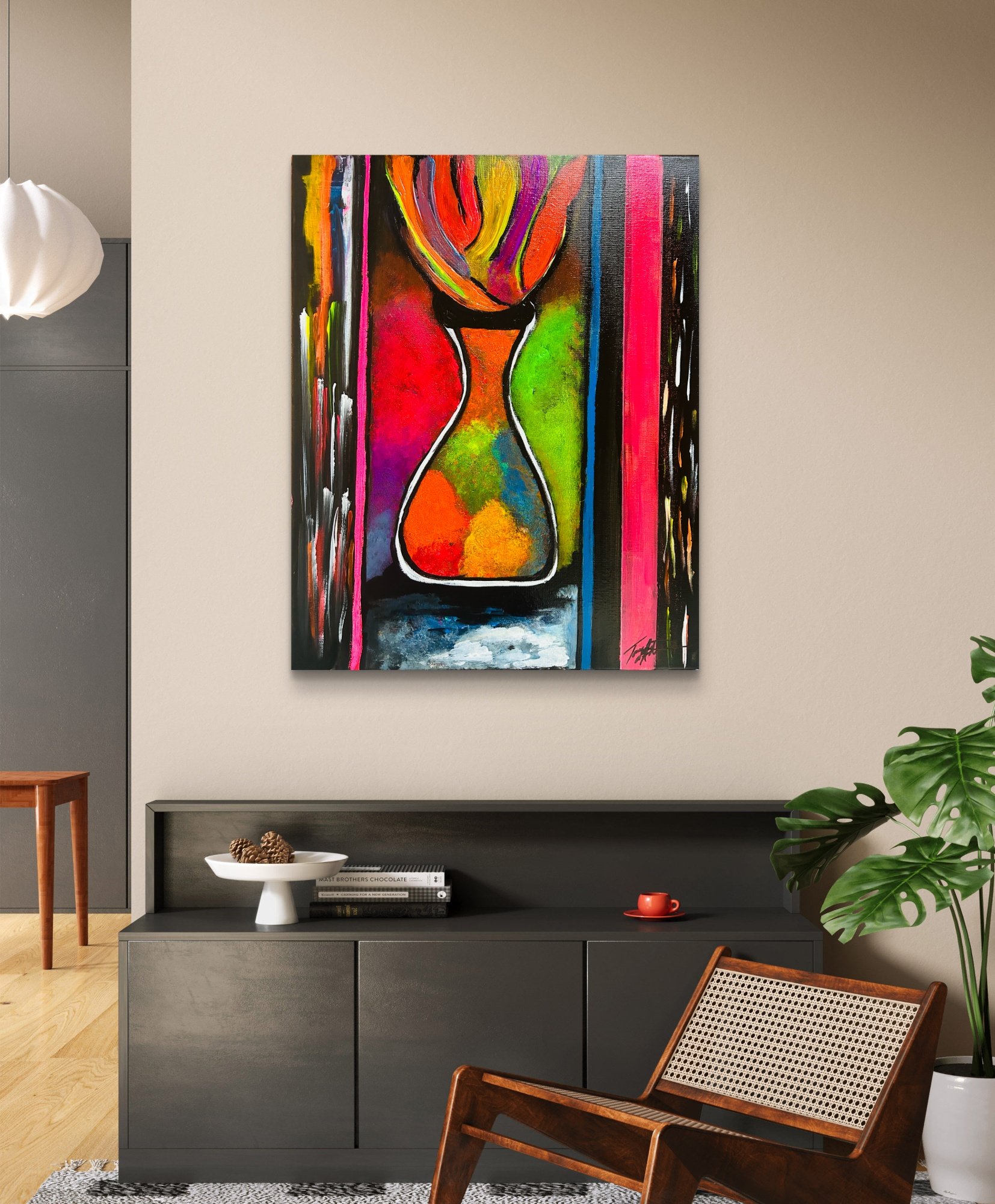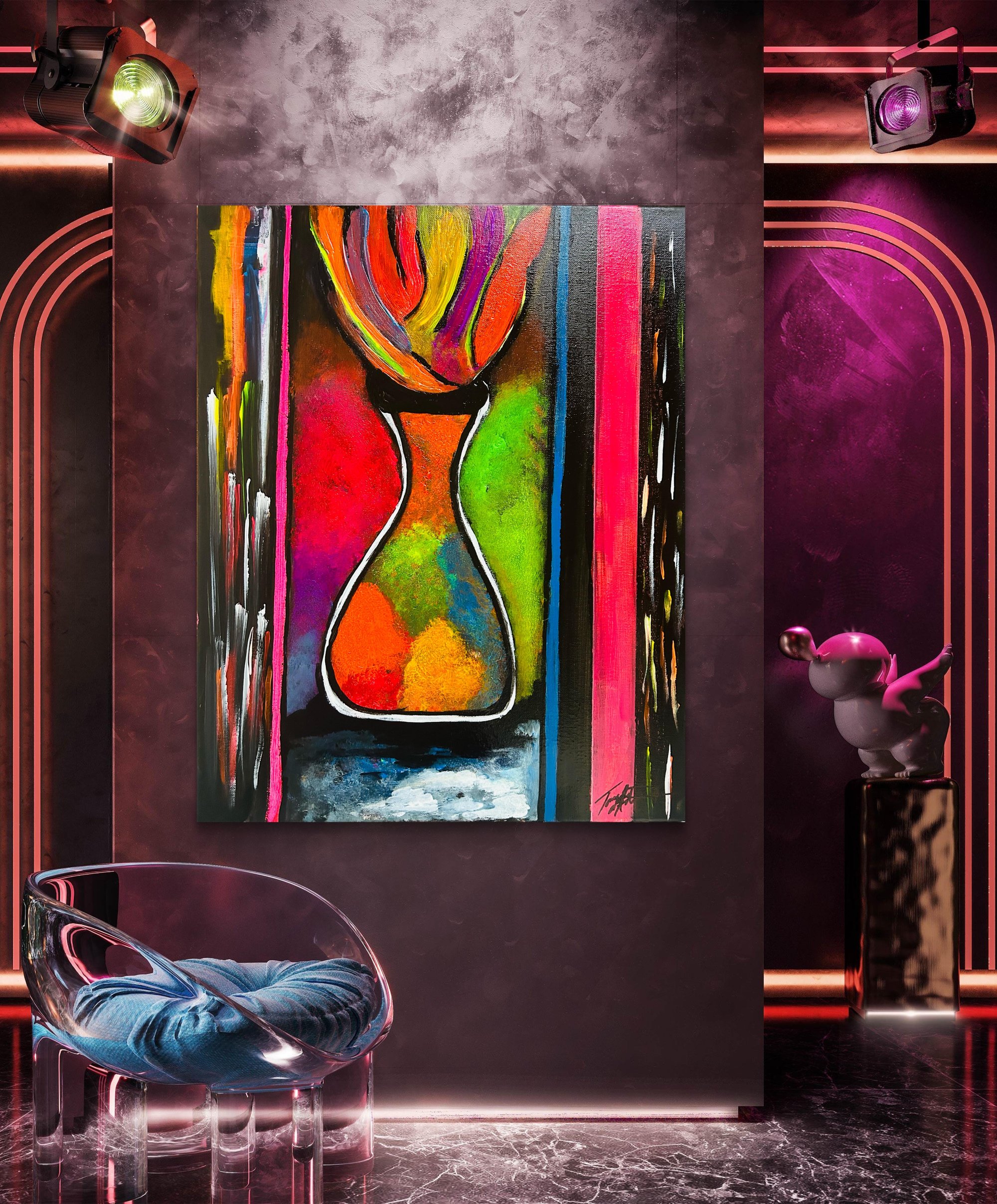 This Painting is called Life Time. It's a 16 x 20 Acrylic Abstract Painting with bright colors. It tells a story how time flies by, but we believes that we can turn the hour glass upside down to regain time. The color of the greens, oranges , pinks and greens gives the painting a depth look as if its flowing in the air.