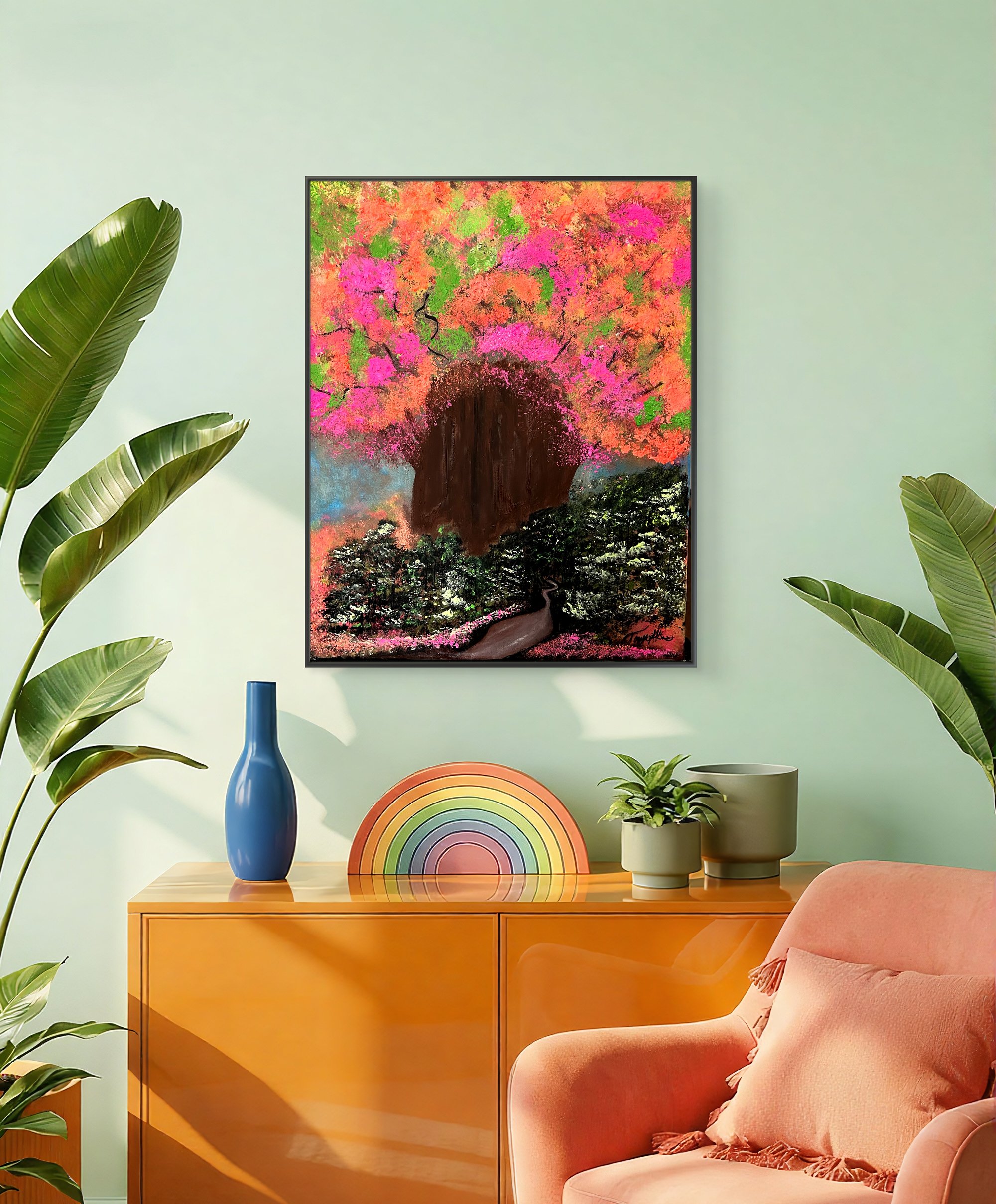 MISTY TRAILS IS A 16 X 20 ACRYLIC LANDSCAPE. THIS PAINTING BRINGS OUT THE BEAUTIFUL COLOR OF THE SPRING. THE PAINTING BRINGS A WARM FEELING OF TRAVELING THROUGH THE HILLS, WITH THE BRIGHT COLORS OF PINK,, YELLOW AND GREEN.