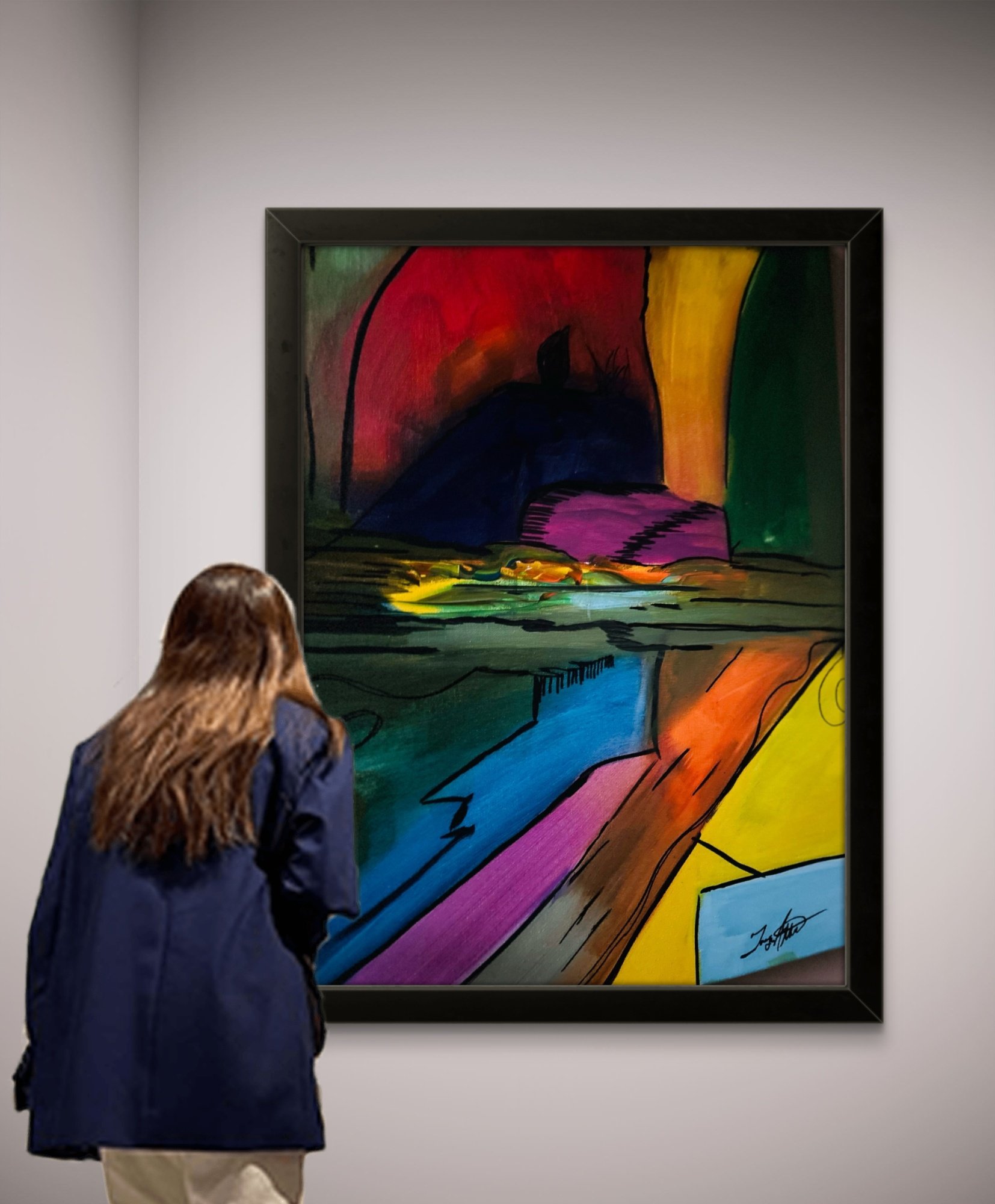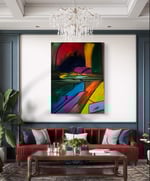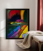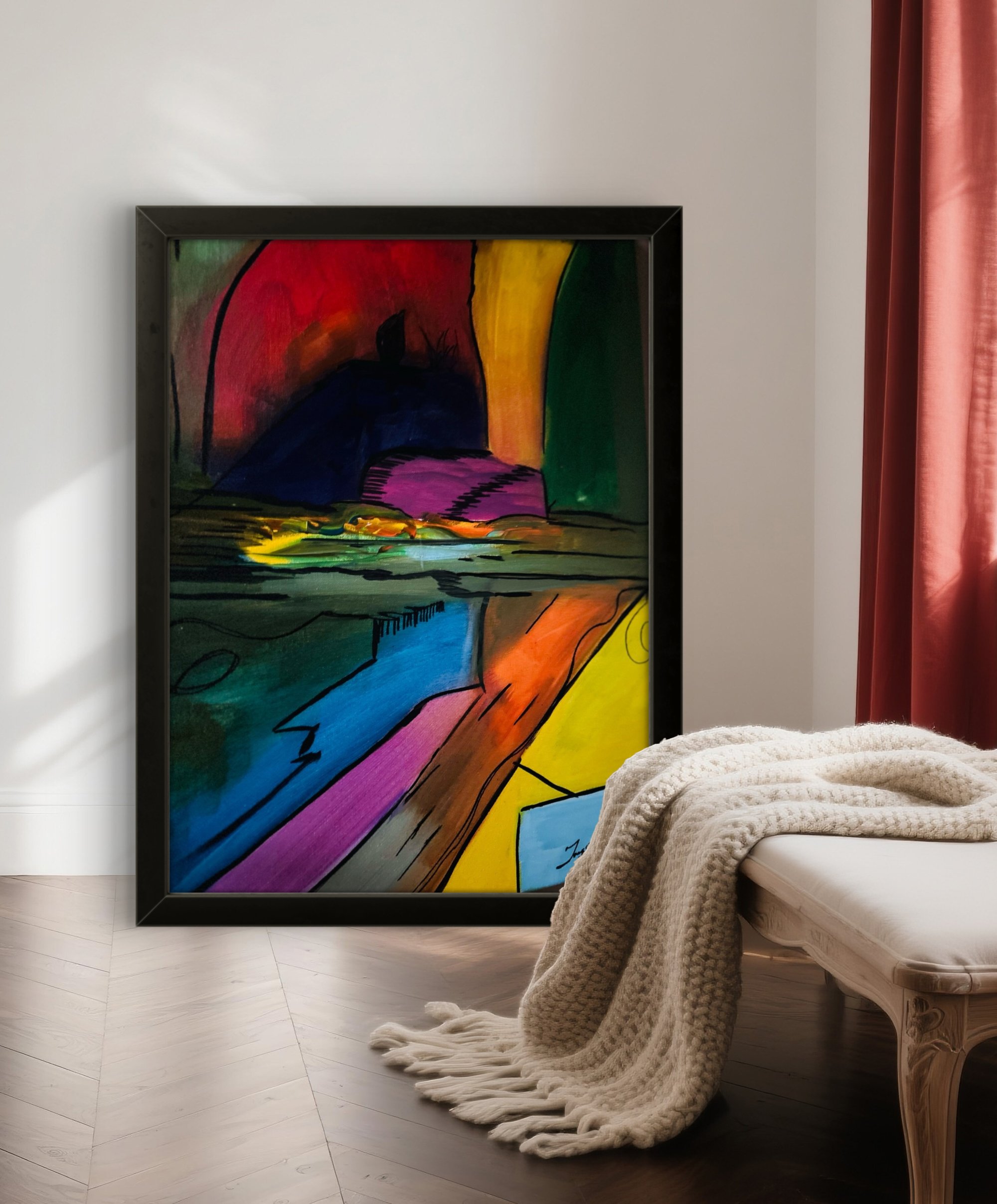 This painting features a surreal and atmospheric abstract composition with a dramatic interplay of vibrant colors and dark accents. The background transitions from deep red and black, suggesting intensity or mystery, to glowing yellow and green tones, evoking light or growth. The foreground includes dynamic shapes in blue, purple, orange, and yellow, separated by bold black lines that create movement and structure. The scene could be interpreted as a symbolic landscape or an exploration of contrasts between light and shadow, calm and chaos.