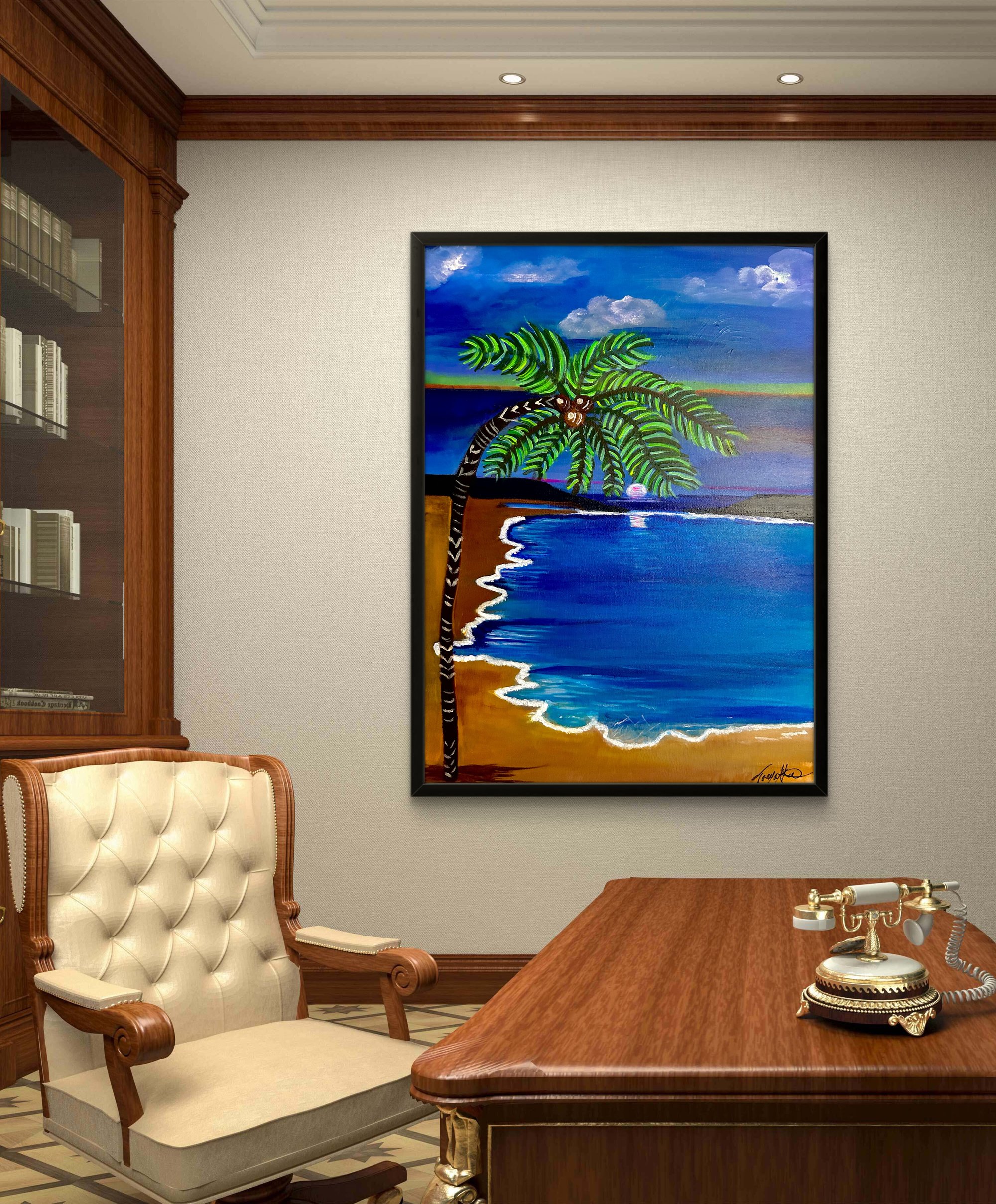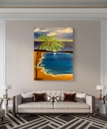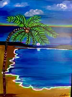 This painting depicts a serene beach scene at twilight, with a lone palm tree arching over a gentle shoreline. The sky is a deep, calming blue with wisps of clouds, and a soft sunset is visible on the horizon, casting a pinkish glow across the water. The waves gently lap at the sandy beach, edged with white highlights that contrast against the rich blue water. The palm tree's leaves are lush and vibrant green, and its trunk is adorned with white markings, adding an artistic touch. The overall atmosphere is peaceful, capturing the beauty of nature at dusk