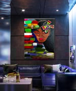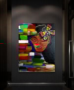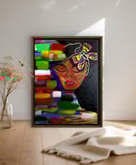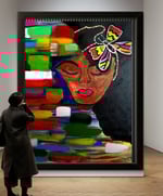 This painting is a vivid and imaginative portrait, blending abstract and figurative elements. At its center is the serene face of a woman with closed eyes, suggesting a state of peace, meditation, or perhaps dreaming. Her skin tone is a rich, earthy brown, and her facial features are outlined with bold, clean lines. The woman's lips are a bright, vibrant pink, which draws attention and contrasts against the darker tones around her.