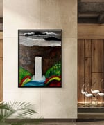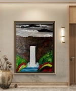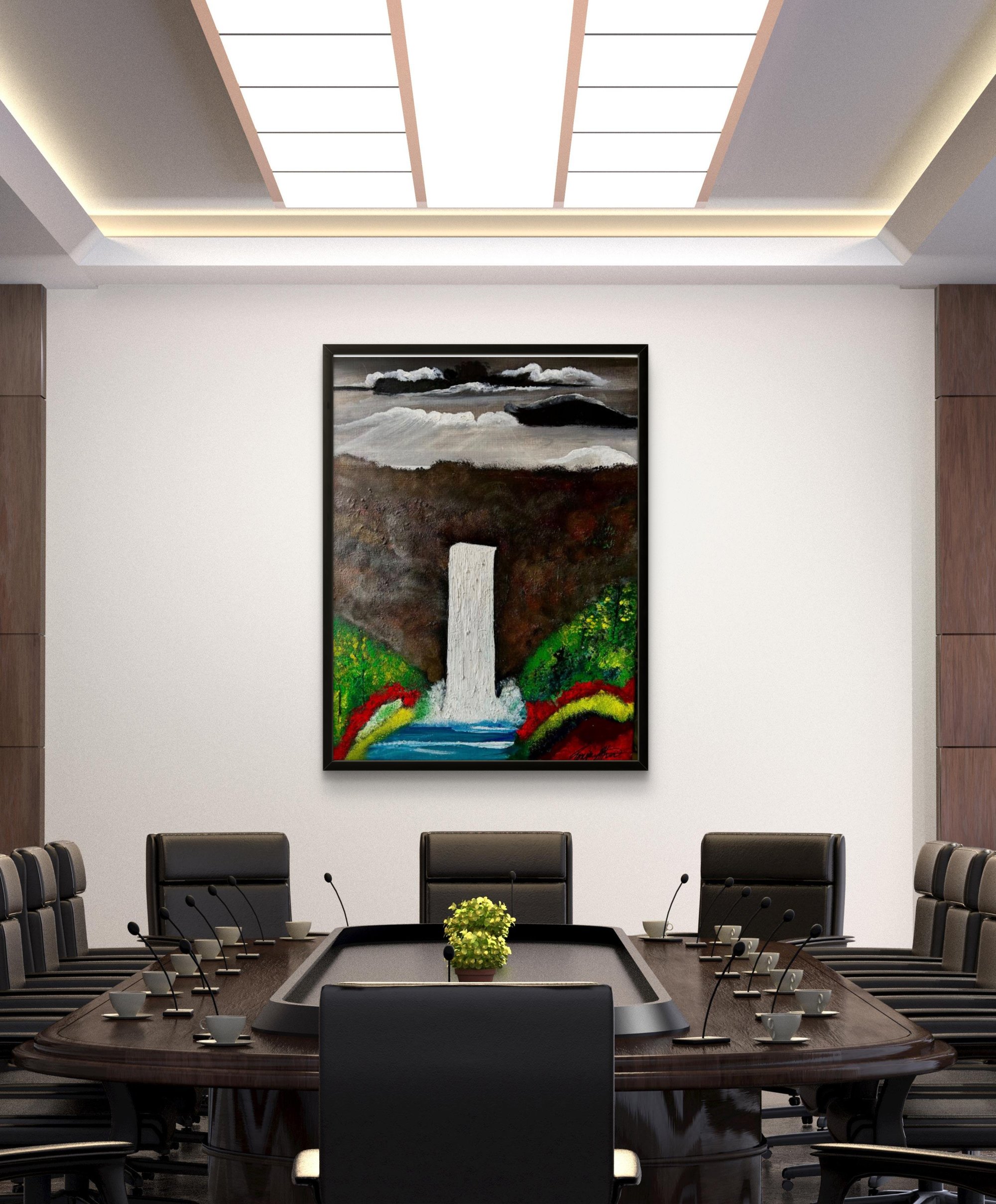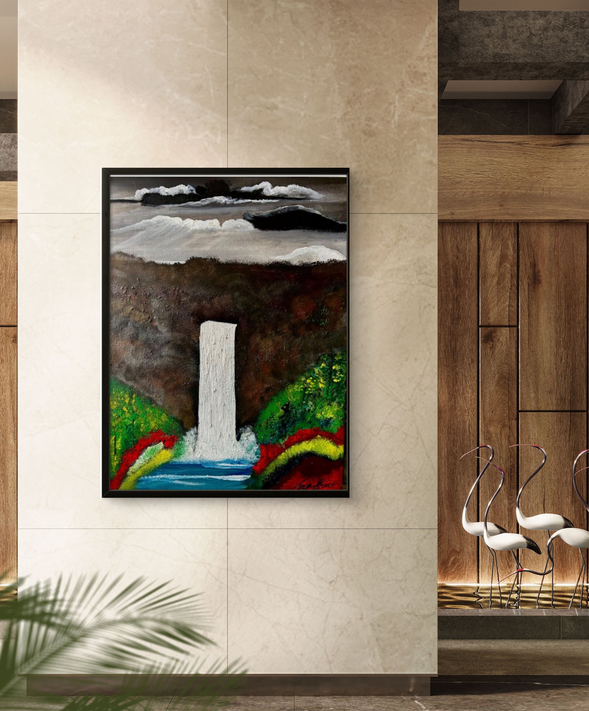 This textured acrylic painting captures the dramatic beauty of nature’s duality where light meets shadow, and stillness meets motion. A powerful white waterfall slices through the heart of a dark, earthen cliff, symbolizing release and renewal.