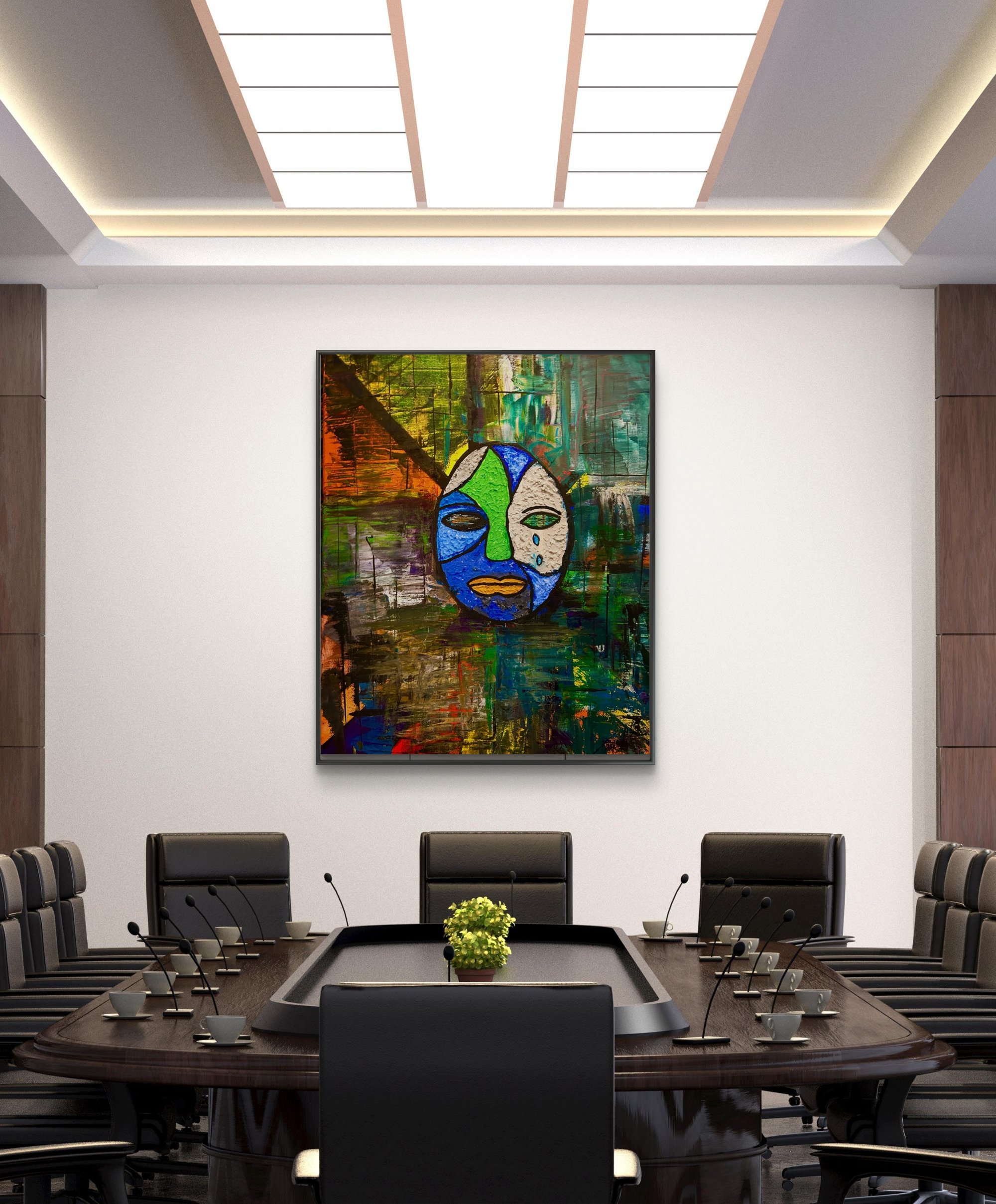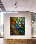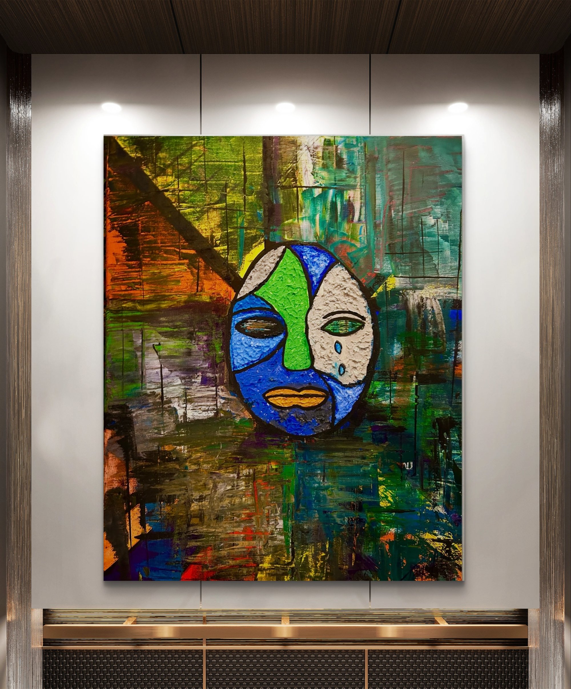 step into a world where color meets emotion in this stunning abstract portrait. "The Mask We Wear" is a powerful visual story that blends deep texture, bold color blocking, and raw human expression. Centered around a vibrant, asymmetrical face painted in vivid hues of cobalt blue, emerald green, and stone beige, the mask features teardrops that echo silent emotion—grief, resilience, and strength.