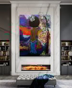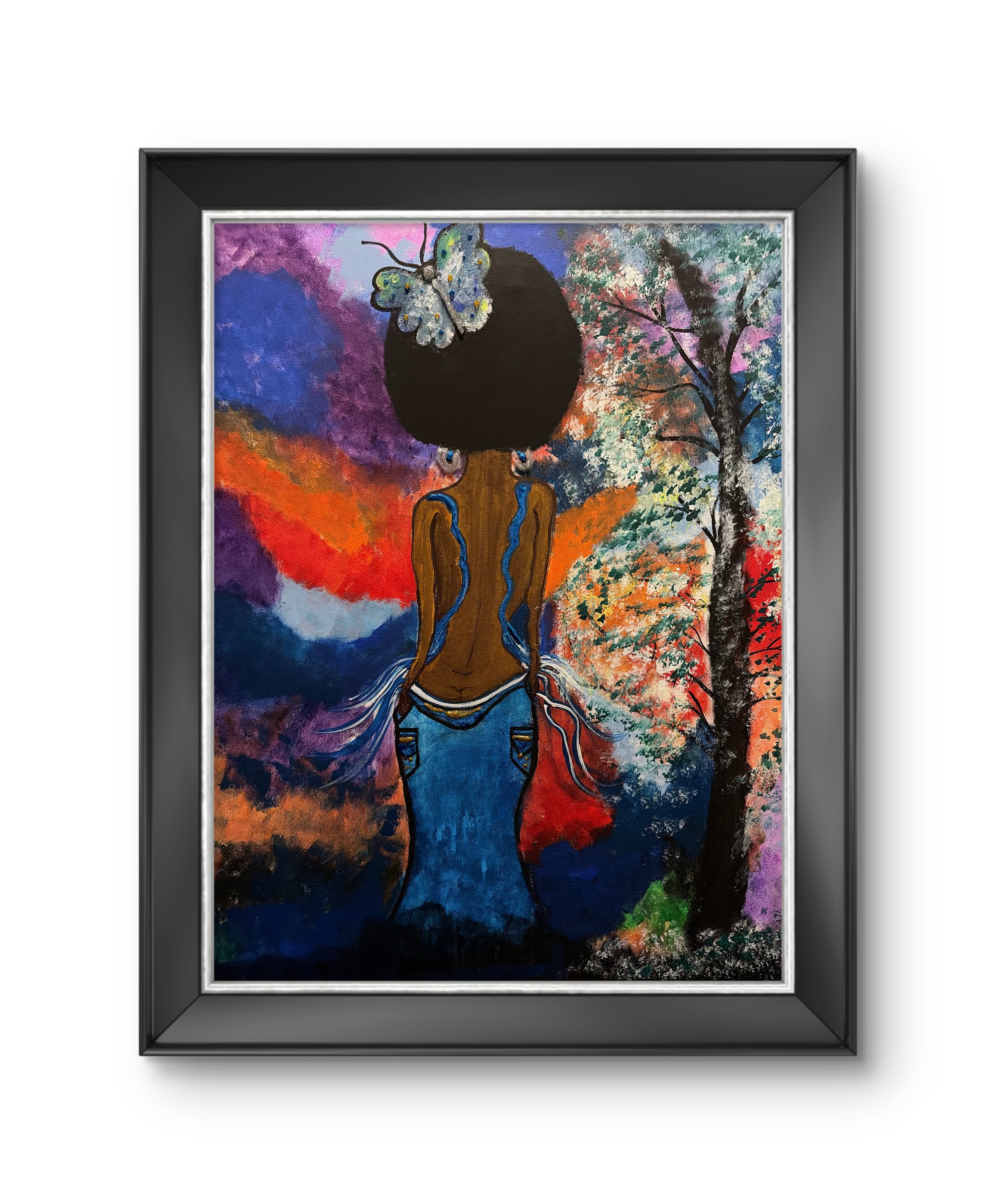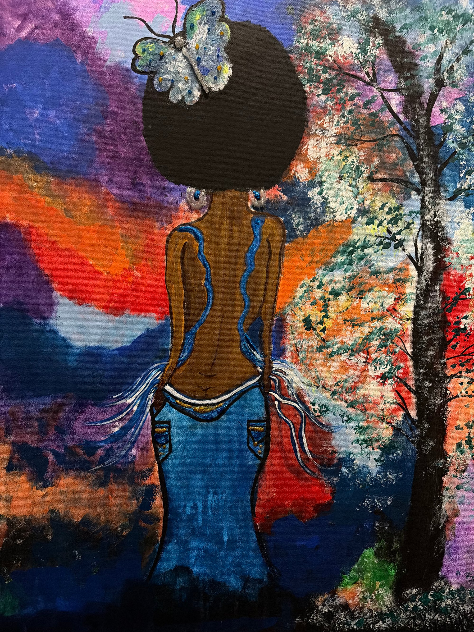 This painting capture a woman standing in a moment of transformation -ground, vulnerable, and quietly powerful. Her bare back tells a story of resilience, marked by flowing lines that resemble emotional pathway, scars, or streams of healing. A delicate butterfly rests atop her head, symbolizing rebirth, freedom, and beauty that emerges after struggle.