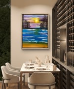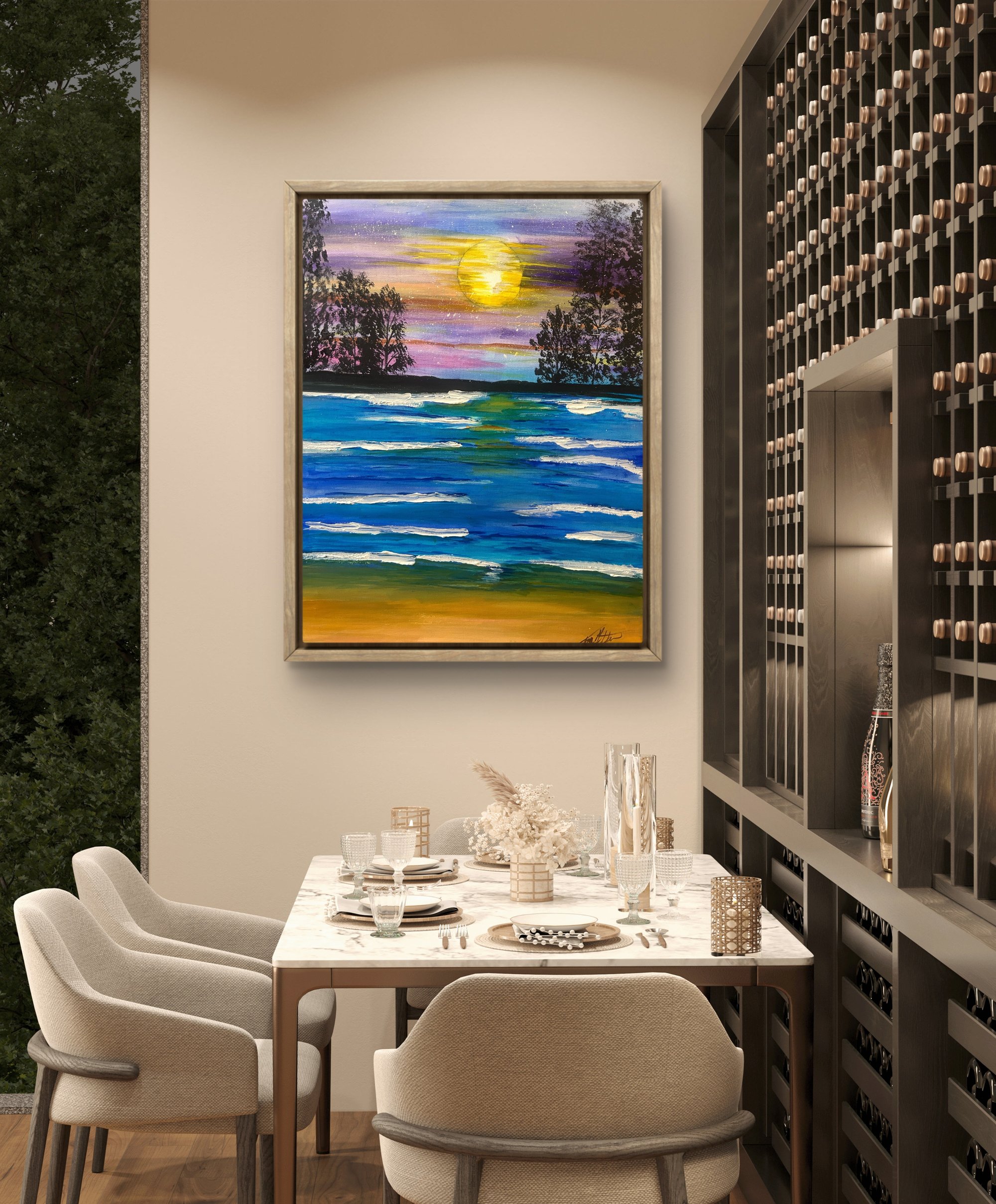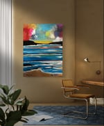 This stunning acrylic painting presents a mesmerizing seascape with a burst of vibrant energy in the sky. The tranquil ocean stretches into the horizon, with layers of deep blues, whites, and subtle streaks of color that ripple through the water, capturing the movement of the tides. On the shore, a sandy dune adds an earthy warmth, grounding the scene. The sky above is a swirl of dramatic, colorful clouds in shades of red, pink, yellow, purple, and blue, evoking a dreamy, almost surreal sunset or sunrise. The contrast between the calm waves and the intense sky invites a sense of both peace and awe. "Tidal Dreams" captures the beauty of nature in motion, reflecting the duality of serenity and the dynamic forces that shape the world around us.