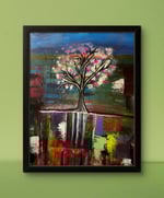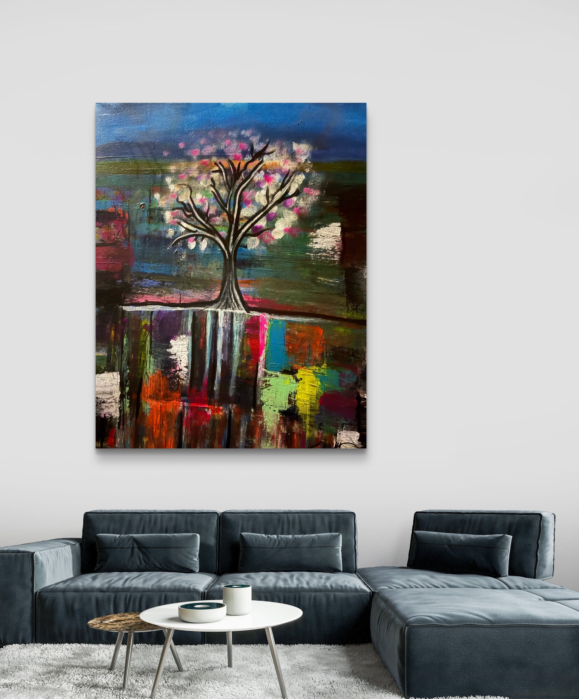 TREE GROWS OUT OF STRESS IS A 16 X 20 ABSTARCT ACRYLIC PAINTING. THIS PAINTING TELLS A STORY OF NO MATTER HOW CHOTIC THINGS MAY GET IT WON'T STOP THE GROWTH , THE COLORS ON THE ROOTS UNDERNETH BRINGS OUT THE DEPTH IN THIS PAINTING.