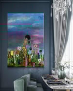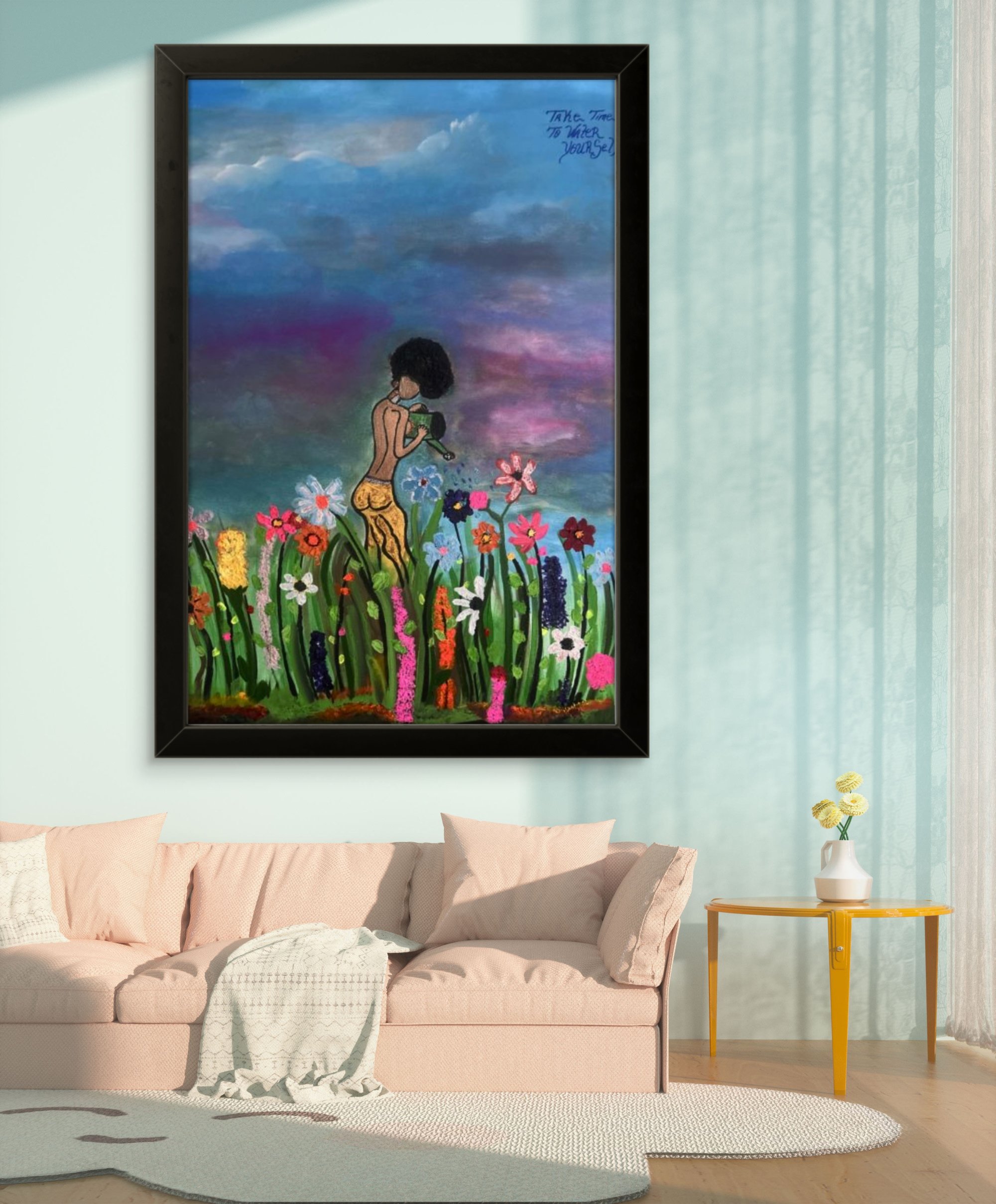 This vibrant acrylic painting depicts a serene figure watering a lush garden of colorful flowers, symbolizing self-care and personal growth. Against a dreamy, multicolored sky, the message "Take time to water yourself" reminds viewers of the importance of nurturing their inner well-being. The figure’s graceful posture and peaceful surroundings evoke a sense of mindfulness and renewal, inviting the audience to reflect on their own journey of self-love and balance. Let this piece inspire you to cultivate your dreams and flourish in your own time.