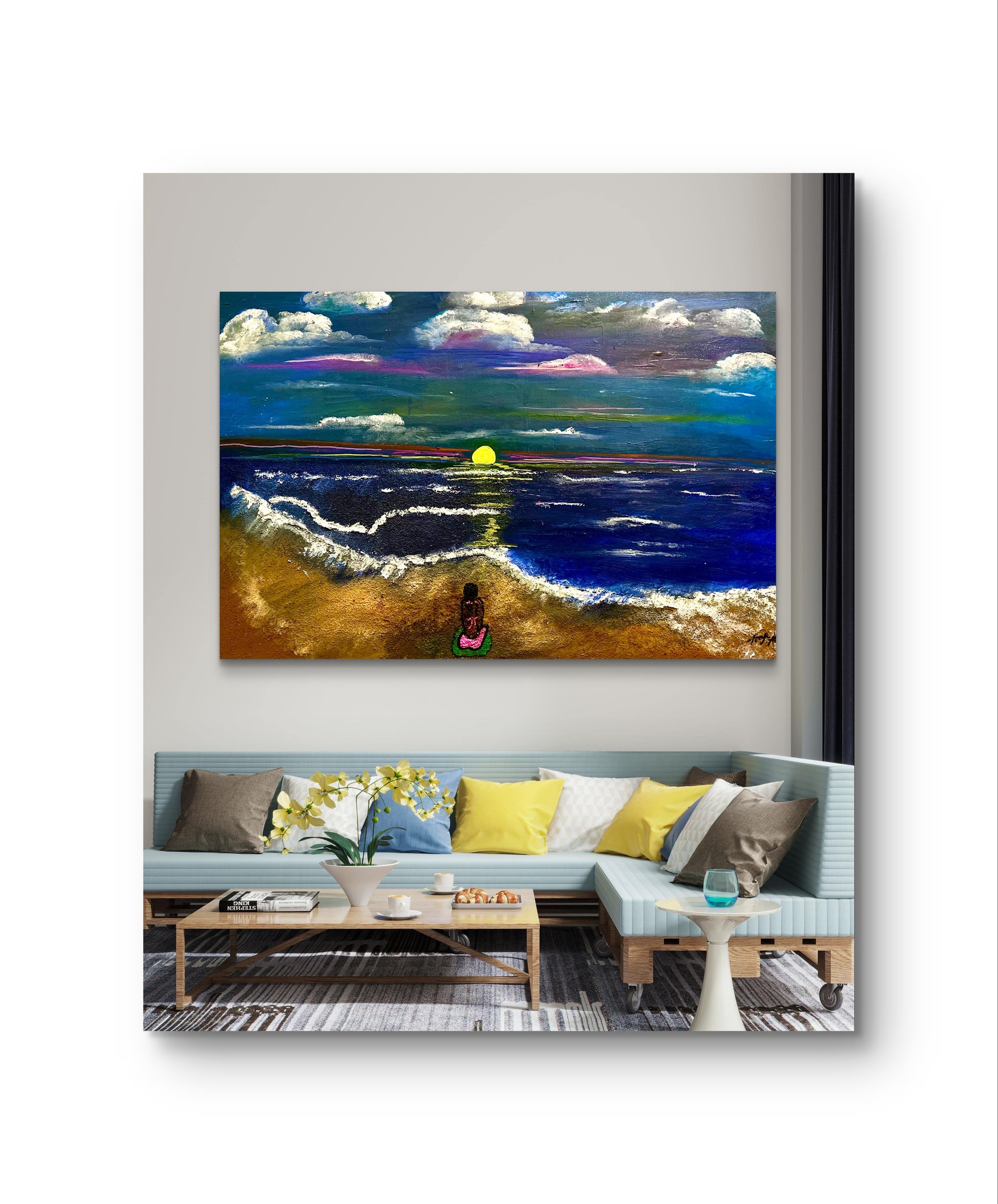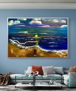 A quiet moment of faith and reflection unfolds as a young girl sits at the edge of the beach, watching the sun descend into the horizon. The warm glow of the sunset wraps around her like a gentle blessing, inviting peace, clarity, and a sense of divine presence. This painting captures the sacred stillness where the heart listens and the spirit finds calm.