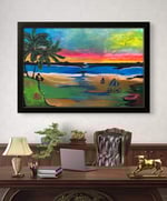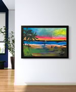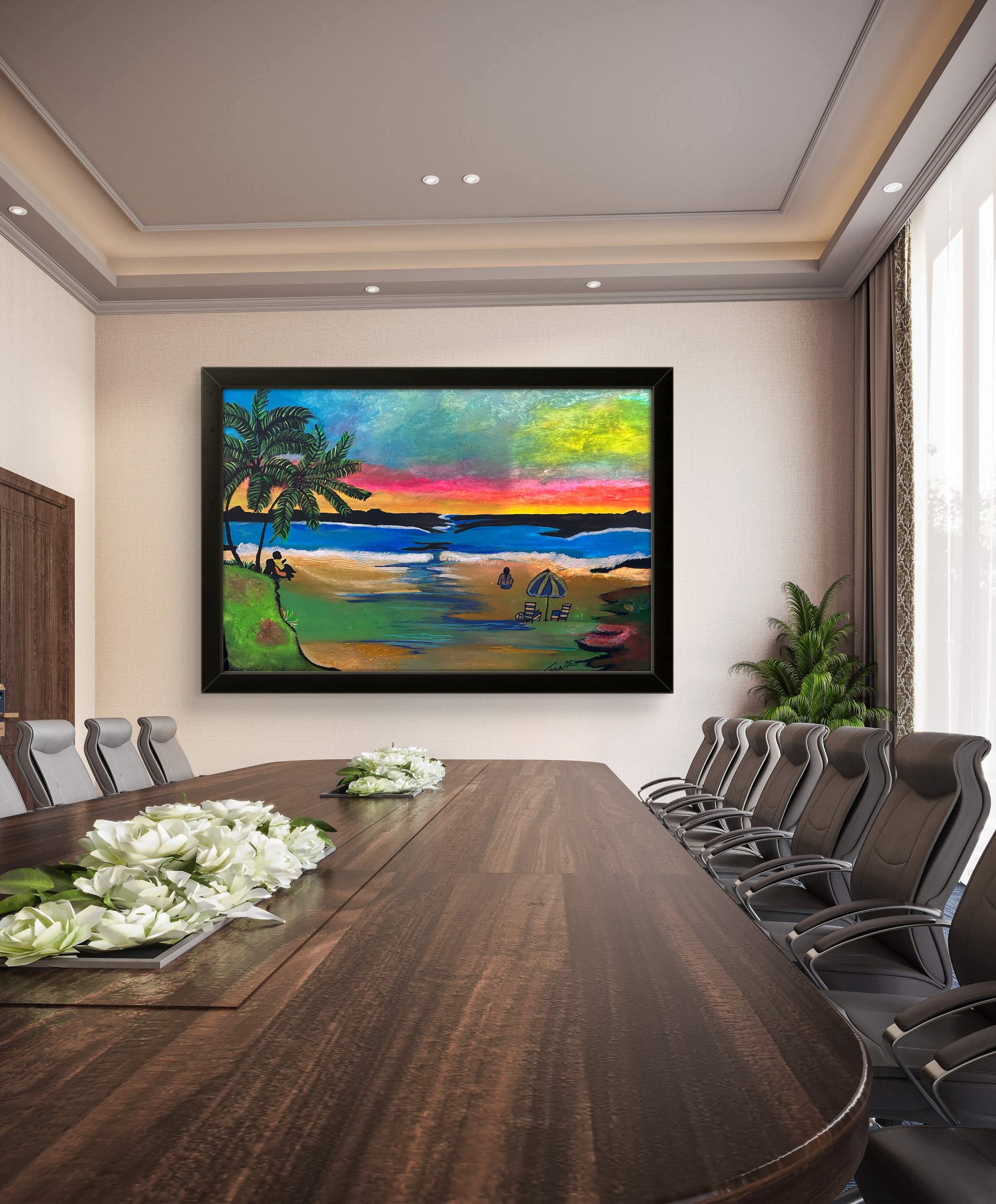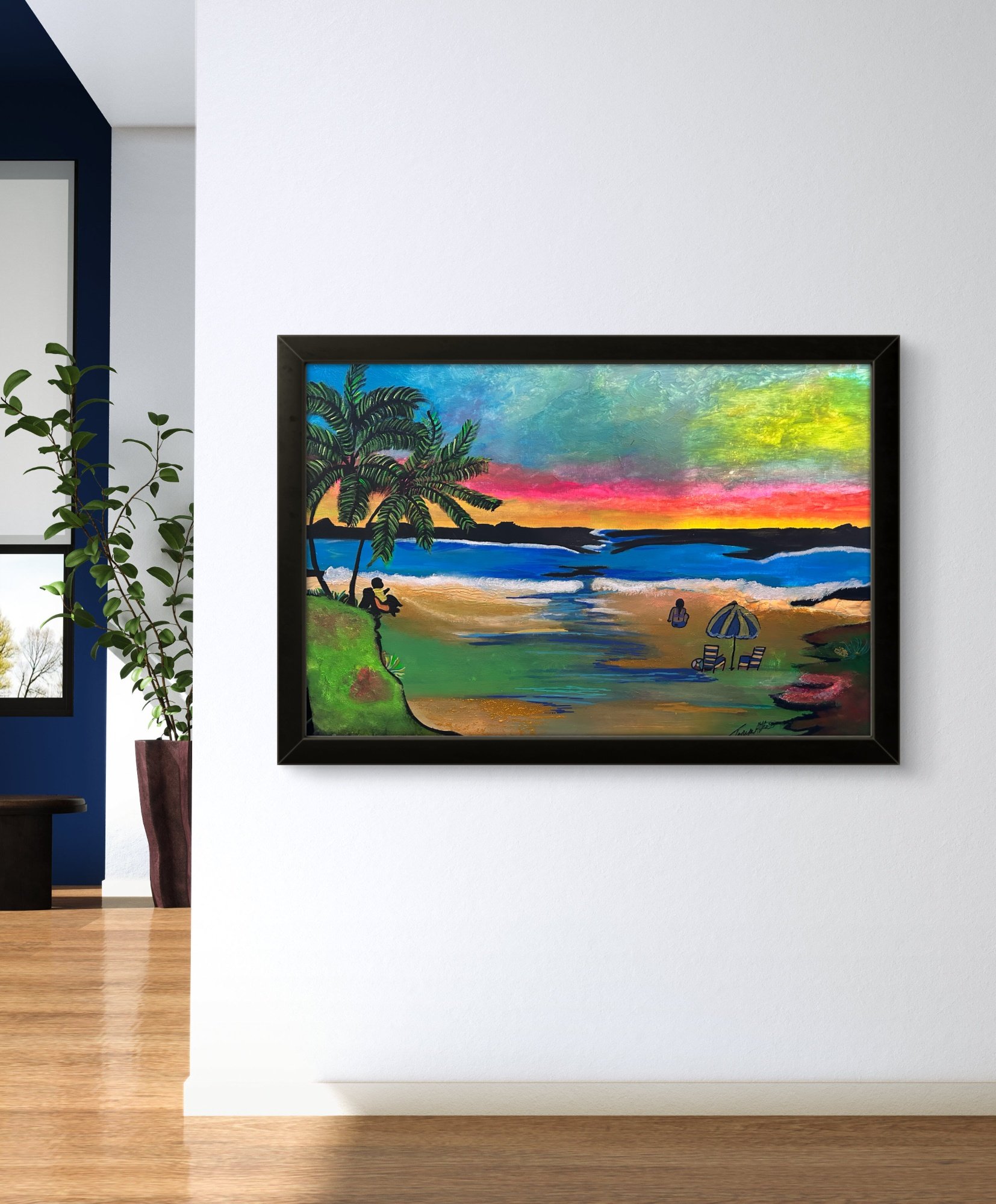 This 36x40 painting captures a moment of peaceful escape, where time slows and the soul exhales. Figures are scattered gently along the shoreline-resting, observing, and simply being. The scene feels unhurried, inviting the viewer to step into a space of calm and reflection